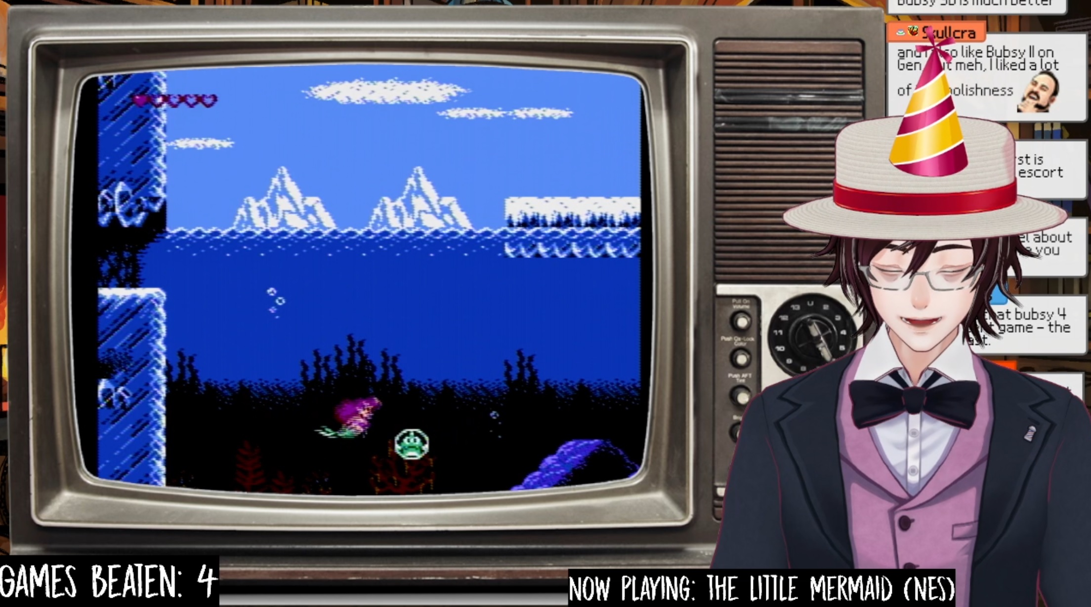 Bloom's celebrating his birthday by beating dozens of gamesHe's 4 down and on nes little mermaid now https://www.twitch.tv/profbloomvtuber