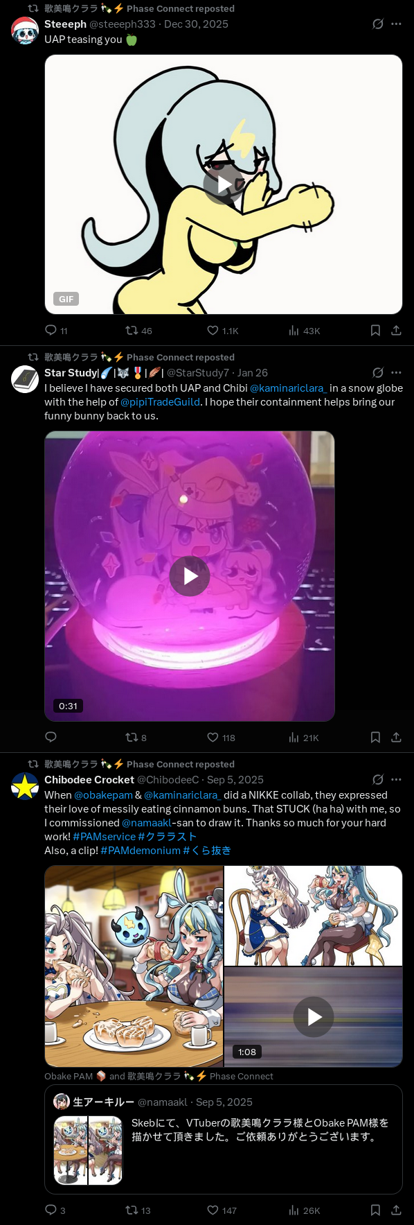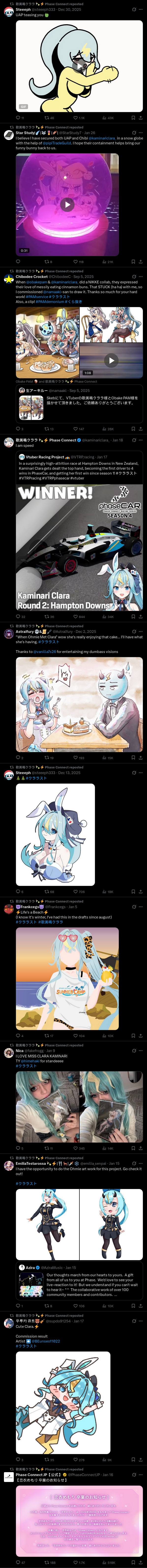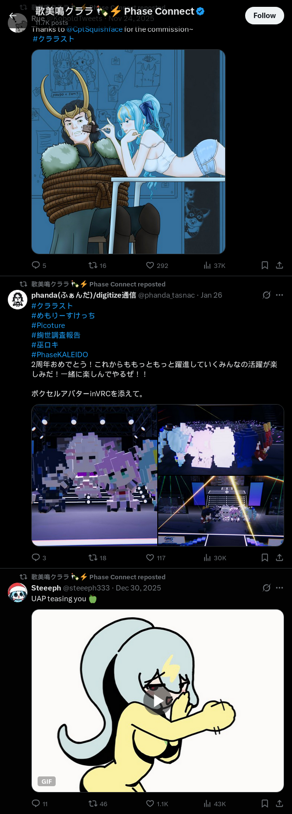 ▼ Phase Connect LinksOfficial Website: https://phase-connect.comOfficial Schedule: https://schedule.phase-connect.comOfficial Twitter: https://x.com/PhaseConnect | https://x.com/PhaseConnectJPOfficial Character References: https://rentry.org/pcgreferencesOfficial Twitch Archive Channels: https://rentry.org/pcgtwitcharchiveUnofficial Phase Connect Archives: https://rentry.org/pcgunofficialarchive––––––––––––––––––––––––––––––––––◆【Lia】https://x.com/rinkouashelia | https://youtube.com/RinkouAshelia | https://twitch.tv/asheliarinkou◆【Utatane Nasa】転寝ナサ (JP) https://x.com/UtataneNasa | https://youtube.com/UtataneNasa | https://twitch.tv/utatanenasa◆【Hakushika Iori】白鹿いおり (JP + EN) https://x.com/hakushikaiori | https://youtube.com/HakushikaIori | https://twitch.tv/iorihakushika◆【Fujikura Uruka】https://x.com/fujikurauruka | https://youtube.com/FujikuraUruka | https://twitch.tv/fujikurauruka◆【Shisui Michiru】紫翠みちる (JP) https://x.com/shisuimichiru | https://youtube.com/ShisuiMichiru | https://twitch.tv/michiru_shisui◆【Tenma Maemi】https://x.com/tenmamaemi | https://youtube.com/TenmaMaemi | https://twitch.tv/tenma◆【Pipkin Pippa】https://x.com/pipkinpippa | https://youtube.com/PipkinPippa | https://twitch.tv/pippa––––––––––––––––––––––––––––––––––◆【Kaneko Lumi】https://x.com/kaneko_lumi | https://youtube.com/KanekoLumi | https://twitch.tv/kanekolumi◆【Fuura Yuri】[Terminated] https://x.com/AmarisYuri | Archive: https://youtube.com/@TheNationalFuuraYuriArchive◆【Dizzy Dokuro】https://x.com/dizzydokuro | https://youtube.com/@dizzydokuro | https://twitch.tv/dizzydokuro◆【Jelly Hoshiumi】https://x.com/jellyhoshiumi | https://youtube.com/@jellyhoshiumi | https://twitch.tv/jellyhoshiumi◆【Ember Amane】https://x.com/emberamane | https://youtube.com/@EmberAmane | https://twitch.tv/emberamane◆【Clio Aite】https://x.com/ClioAite | https://youtube.com/@ClioAite | https://twitch.tv/clioaite◆【MariMari_en】https://x.com/MARIMARI_EN | https://youtube.com/@MARIMARI_EN | https://twitch.tv/marimari_en◆【Eepy Sleepy】https://x.com/EepySleepyCh | https://youtube.com/@EepySleepyCh | https://twitch.tv/EepySleepy––––––––––––––––––––––––––––––––––◆【Remilia Nephys】https://x.com/Remilia_Nephys | https://youtube.com/RemiliaNephys | https://twitch.tv/remilianephys◆【Chisaka Airi】https://x.com/ChisakaAiri | https://youtube.com/ChisakaAiri | https://twitch.tv/chisakaairi◆【Amanogawa Shiina】https://x.com/AmanogawaShiina | https://youtube.com/AmanogawaShiina | https://twitch.tv/amanogawashiina◆【Himemiya Rie】https://x.com/HimemiyaRie | https://youtube.com/HimemiyaRie | https://twitch.tv/himemiyarie◆【Erina Makina】https://x.com/ErinaMakina | https://youtube.com/ErinaMakina | https://twitch.tv/erinamakina◆【Komachi Panko】https://x.com/komachipanko | https://youtube.com/KomachiPanko | https://twitch.tv/komachipanko––––––––––––––––––––––––––––––––––◆【Runie Ruse】https://x.com/RunieRuse | https://youtube.com/@RunieRuse | https://twitch.tv/RunieRuse◆【Eimi Isami】https://x.com/eimiisami | https://youtube.com/@eimiisami | https://twitch.tv/eimiisami◆【Muu Muyu】https://x.com/Muu_Muyu | https://youtube.com/@MuuMuyu | https://twitch.tv/MuuMuyu◆【Hikanari Hina】https://x.com/HikanariHina | https://youtube.com/@HikanariHina | https://twitch.tv/HikanariHina◆【Saya Sairroxs】[Graduated] https://x.com/sayasairroxs | https://youtube.com/@sayasairroxs | https://twitch.tv/sayasairroxs––––––––––––––––––––––––––––––––––◆【Kannagi Loki】巫ロキ (JP) https://x.com/kannagiloki | https://youtube.com/@kannagiloki◆【Kokoromo Memory】[Graduated] https://x.com/kokoromomemory | https://youtube.com/@kokoromomemory_ | https://twitch.tv/kokoromomemory◆【Gram Pico】倉夢ぴこ (JP) https://x.com/grampico_ | https://youtube.com/@grampico | https://twitch.tv/grampico◆【Ayase Yuu】絢世ユウ (JP) https://x.com/ayaseyuuu | https://youtube.com/@ayaseyuu | https://twitch.tv/ayaseyuu_◆【Kaminari Clara】歌美鳴クララ (EN + JP) https://x.com/kaminariclara_ | https://youtube.com/@kaminariclara | https://twitch.tv/kaminariclara––––––––––––––––––––––––––––––––––◆【Malice Evermore】https://x.com/MaliceEvermore | https://youtube.com/@maliceevermore | https://twitch.tv/maliceevermore◆【Nitya Nil】https://x.com/Nitya_Nil | https://youtube.com/@Nitya_Nil | https://twitch.tv/nitya_nil◆【Wilhelmina Frost】https://x.com/wilhelminafr0st | https://youtube.com/@wilhelminafrost | https://twitch.tv/wilhelminafrost◆【Bibi Biscuit】https://x.com/BibiBiscuitCh | https://youtube.com/@bibibiscuitch | https://twitch.tv/bibibiscuitch◆【Anya Nyabyss】https://x.com/AnyaNyabyss | https://youtube.com/@AnyaNyabyss | https://twitch.tv/anyanyabyss◆【Sinon Sinfonia】https://x.com/SinonSinfonia | https://youtube.com/@SinonSinfonia | https://twitch.tv/sinonsinfoniaPrevious Thread: >>109240506