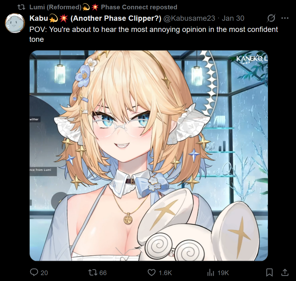 She's a bug??? Edition>What is /lig/?/lig/ is a thread for viewers to find, share, and discuss indie vtubers who have on average 500 viewers or more.>Why /lig/?Large indie vtubers have more net fans, but they are outnumbered by 2views by the thousands. This is a thread for the VIP, regardless of what language they stream on.>Can I shill my 499view oshi here?Considering averages fluctuate widely, all the way down to 100 is reasonable. The minimal requirement however is being Twitch partner or the YouTube equivalent in numbers.>Wait isn't that one a corpo?/lig/ is a thread for chuubas of a decent size who aren't defined by their corporate branding, either due to the small size of the corporation or the independence and lack of oversight granted to the talents>/lig/ Numbershttps://lignumbers.neocities.org/>Twitch Clips Guidehttps://pastelink.net/34vd5>VOD Archival Guidehttps://rentry.org/Vod_Archival_Guide>/lig/ VOD Archivehttps://rentry.org/Indie_Vod_Archives_lig>Koikatsu cardshttps://mega.nz/folder/JYtkXJwL#07gAQCQqI_9FsmX9oQJKSA>/lig/ Wheel of Nameshttps://wheelofnames.com/5jh-93j>Tiermakerhttps://tiermaker.com/create/-lig--16586688-3>/lig/ Chuuba Birthday Calendar (WIP)https://www.canva.com/design/DAE-XgWodVg/ofLz4QC1yPPQ4T6TTAE0fw/edit?utm_content=DAE-XgWodVg>Upcoming BirthdaysFebruary 9th - Meat & wwParasiFebruary 13th - KokonutsFebruary 14th - ReiyuguiguiFebruary 15th - SaaFebruary 18th - Moon JellyFebruary 22nd - HinaBoBinaFebruary 24th - SnuffyFebruary 27th - AsariMarch 6th - Lucy Pyre & Fuzuki MikiMarch 9th - SavehymnMarch 12th - Anya Melfissa & Haruka Karibu>OC material for the OPhttps://mega.nz/folder/IIVD1IaJ#cfsRhWdJvzneIoG8HZUPuw>/lig/booruhttps://ligbooru.moe/>Duckshttps://www.twitch.tv/dashducks >Birbshttps://www.youtube.com/@NashvilleBirdCamOther useful threads:>>>/vt//big/>>>/vt//corpo/>>>/vt//choc/>>>/vt//flip/>>>/vt//haha/>>>/vt//indie/>>>/vt//mint/>>>/vt//swarm/>>>/vt//vrt/>>>/vt//xvsj+/Previous Thread: >>109241400
