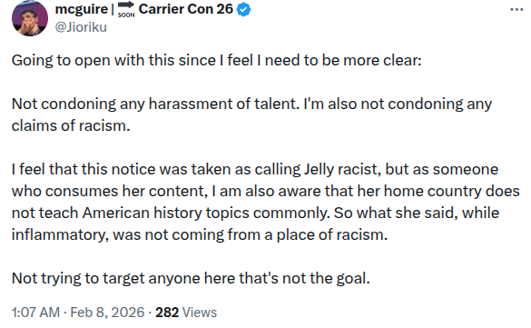 >>109272650No, that is an accurate interpretation. 6.1 million people have seen that apology. 6.1 million people have seen Jelly portrayed as potentially racist in an apology to satisfy a Twitter hate mob (and it didn't satisfy them btw). If the company doesn't publicly walk this back and only apologizes to Jelly in public, all those people (and more) are going to go forward thinking Jelly is racist. Forever.