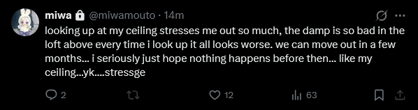 >>109276833Replacing ceiling drywall is a huge pain in the ass and it's easy to procrastinate calling in a pro to get it done.