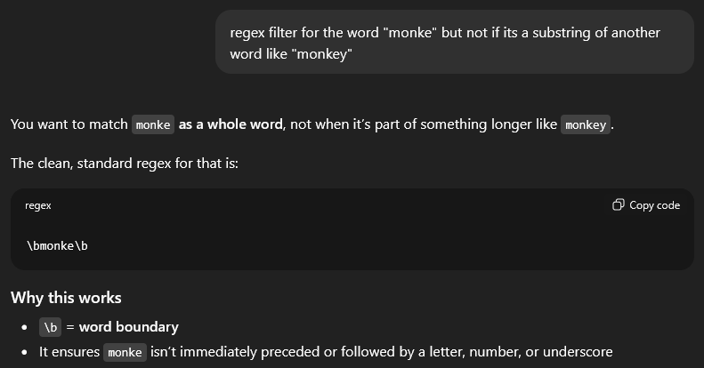 >>109278629the full line will look like this/\bmonke\b/i