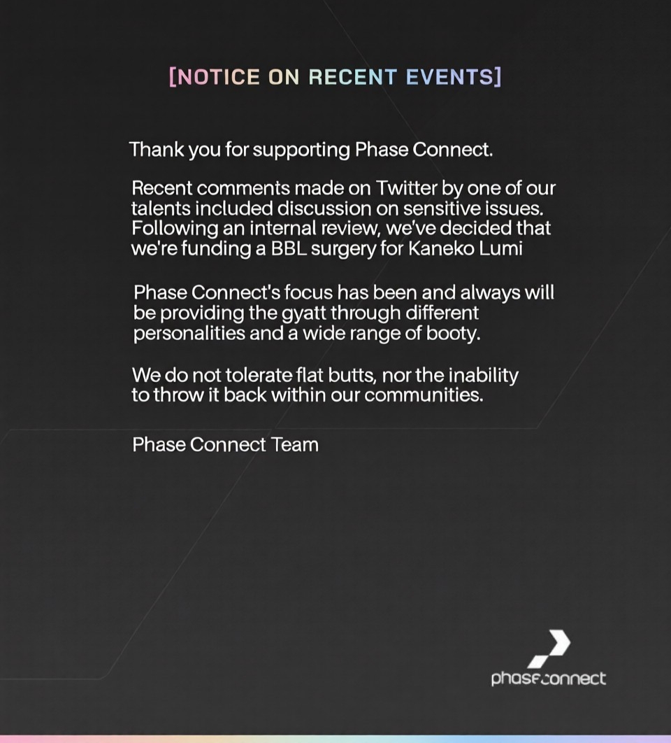 ▼ Phase Connect LinksOfficial Website: https://phase-connect.comOfficial Schedule: https://schedule.phase-connect.comOfficial Twitter: https://x.com/PhaseConnect | https://x.com/PhaseConnectJPOfficial Character References: https://rentry.org/pcgreferencesOfficial Twitch Archive Channels: https://rentry.org/pcgtwitcharchiveUnofficial Phase Connect Archives: https://rentry.org/pcgunofficialarchive––––––––––––––––––––––––––––––––––◆【Lia】https://x.com/rinkouashelia | https://youtube.com/RinkouAshelia | https://twitch.tv/asheliarinkou◆【Utatane Nasa】転寝ナサ (JP) https://x.com/UtataneNasa | https://youtube.com/UtataneNasa | https://twitch.tv/utatanenasa◆【Hakushika Iori】白鹿いおり (JP + EN) https://x.com/hakushikaiori | https://youtube.com/HakushikaIori | https://twitch.tv/iorihakushika◆【Fujikura Uruka】https://x.com/fujikurauruka | https://youtube.com/FujikuraUruka | https://twitch.tv/fujikurauruka◆【Shisui Michiru】紫翠みちる (JP) https://x.com/shisuimichiru | https://youtube.com/ShisuiMichiru | https://twitch.tv/michiru_shisui◆【Tenma Maemi】https://x.com/tenmamaemi | https://youtube.com/TenmaMaemi | https://twitch.tv/tenma◆【Pipkin Pippa】https://x.com/pipkinpippa | https://youtube.com/PipkinPippa | https://twitch.tv/pippa––––––––––––––––––––––––––––––––––◆【Kaneko Lumi】https://x.com/kaneko_lumi | https://youtube.com/KanekoLumi | https://twitch.tv/kanekolumi◆【Fuura Yuri】[Terminated] https://x.com/AmarisYuri | Archive: https://youtube.com/@TheNationalFuuraYuriArchive◆【Dizzy Dokuro】https://x.com/dizzydokuro | https://youtube.com/@dizzydokuro | https://twitch.tv/dizzydokuro◆【Jelly Hoshiumi】https://x.com/jellyhoshiumi | https://youtube.com/@jellyhoshiumi | https://twitch.tv/jellyhoshiumi◆【Ember Amane】https://x.com/emberamane | https://youtube.com/@EmberAmane | https://twitch.tv/emberamane◆【Clio Aite】https://x.com/ClioAite | https://youtube.com/@ClioAite | https://twitch.tv/clioaite◆【MariMari_en】https://x.com/MARIMARI_EN | https://youtube.com/@MARIMARI_EN | https://twitch.tv/marimari_en◆【Eepy Sleepy】https://x.com/EepySleepyCh | https://youtube.com/@EepySleepyCh | https://twitch.tv/EepySleepy––––––––––––––––––––––––––––––––––◆【Remilia Nephys】https://x.com/Remilia_Nephys | https://youtube.com/RemiliaNephys | https://twitch.tv/remilianephys◆【Chisaka Airi】https://x.com/ChisakaAiri | https://youtube.com/ChisakaAiri | https://twitch.tv/chisakaairi◆【Amanogawa Shiina】https://x.com/AmanogawaShiina | https://youtube.com/AmanogawaShiina | https://twitch.tv/amanogawashiina◆【Himemiya Rie】https://x.com/HimemiyaRie | https://youtube.com/HimemiyaRie | https://twitch.tv/himemiyarie◆【Erina Makina】https://x.com/ErinaMakina | https://youtube.com/ErinaMakina | https://twitch.tv/erinamakina◆【Komachi Panko】https://x.com/komachipanko | https://youtube.com/KomachiPanko | https://twitch.tv/komachipanko––––––––––––––––––––––––––––––––––◆【Runie Ruse】https://x.com/RunieRuse | https://youtube.com/@RunieRuse | https://twitch.tv/RunieRuse◆【Eimi Isami】https://x.com/eimiisami | https://youtube.com/@eimiisami | https://twitch.tv/eimiisami◆【Muu Muyu】https://x.com/Muu_Muyu | https://youtube.com/@MuuMuyu | https://twitch.tv/MuuMuyu◆【Hikanari Hina】https://x.com/HikanariHina | https://youtube.com/@HikanariHina | https://twitch.tv/HikanariHina◆【Saya Sairroxs】[Graduated] https://x.com/sayasairroxs | https://youtube.com/@sayasairroxs | https://twitch.tv/sayasairroxs––––––––––––––––––––––––––––––––––◆【Kannagi Loki】巫ロキ (JP) https://x.com/kannagiloki | https://youtube.com/@kannagiloki◆【Kokoromo Memory】[Graduated] https://x.com/kokoromomemory | https://youtube.com/@kokoromomemory_ | https://twitch.tv/kokoromomemory◆【Gram Pico】倉夢ぴこ (JP) https://x.com/grampico_ | https://youtube.com/@grampico | https://twitch.tv/grampico◆【Ayase Yuu】絢世ユウ (JP) https://x.com/ayaseyuuu | https://youtube.com/@ayaseyuu | https://twitch.tv/ayaseyuu_◆【Kaminari Clara】歌美鳴クララ (EN + JP) https://x.com/kaminariclara_ | https://youtube.com/@kaminariclara | https://twitch.tv/kaminariclara––––––––––––––––––––––––––––––––––◆【Malice Evermore】https://x.com/MaliceEvermore | https://youtube.com/@maliceevermore | https://twitch.tv/maliceevermore◆【Nitya Nil】https://x.com/Nitya_Nil | https://youtube.com/@Nitya_Nil | https://twitch.tv/nitya_nil◆【Wilhelmina Frost】https://x.com/wilhelminafr0st | https://youtube.com/@wilhelminafrost | https://twitch.tv/wilhelminafrost◆【Bibi Biscuit】https://x.com/BibiBiscuitCh | https://youtube.com/@bibibiscuitch | https://twitch.tv/bibibiscuitch◆【Anya Nyabyss】https://x.com/AnyaNyabyss | https://youtube.com/@AnyaNyabyss | https://twitch.tv/anyanyabyss◆【Sinon Sinfonia】https://x.com/SinonSinfonia | https://youtube.com/@SinonSinfonia | https://twitch.tv/sinonsinfoniaPrevious Thread: >>109280111
