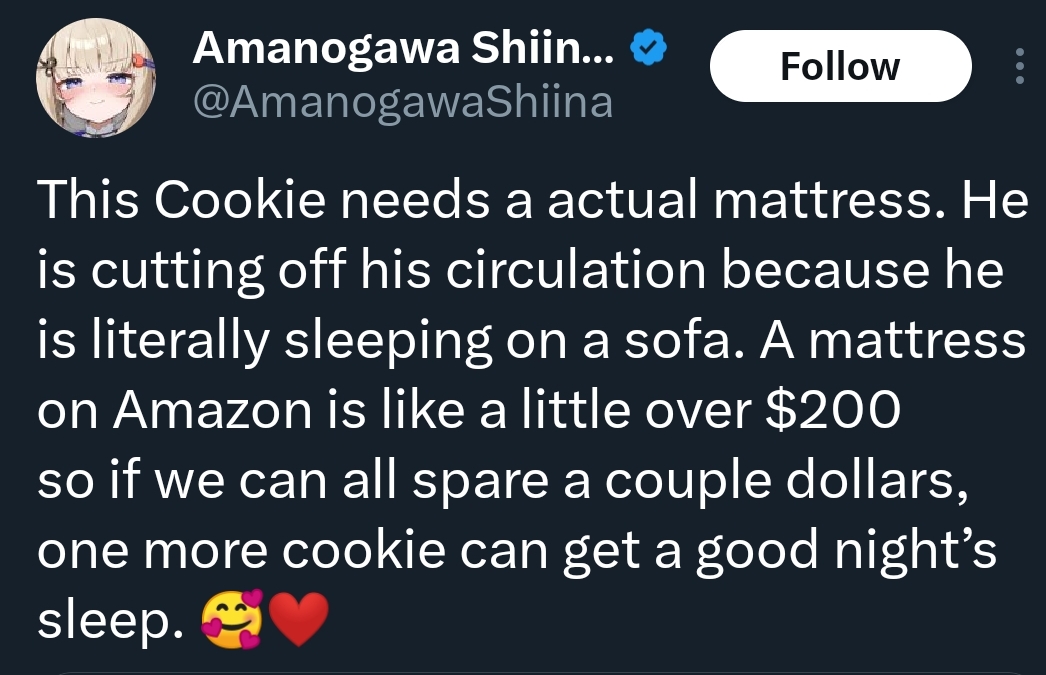 >>109284205She noticed one of her community members didn't have a bed to sleep on so she crowdfunded a mattress for him, why are you complaining? Are you female?