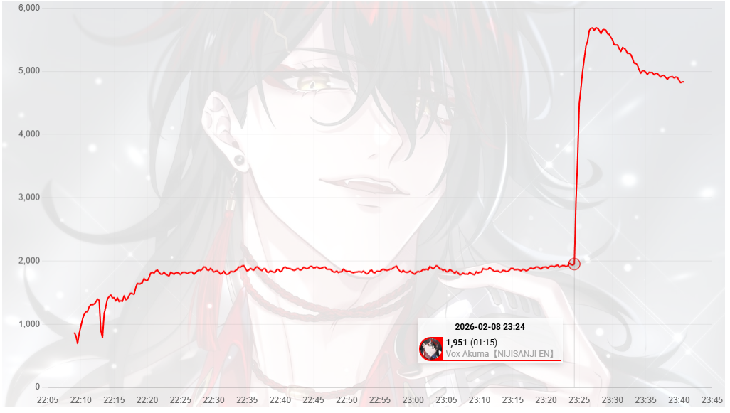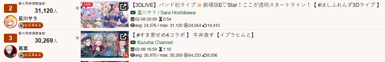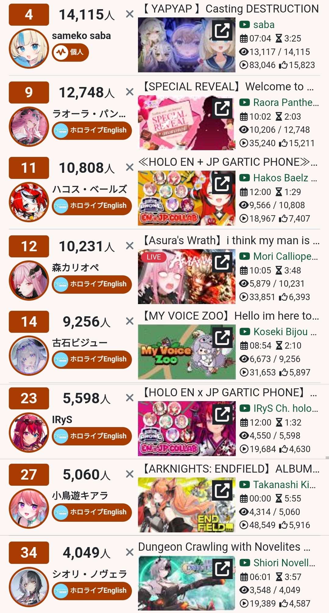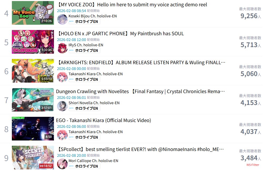 *FEBRUARY 8TH 2026 FINAL EN TALLY*>14,115: Saba (Indie)>13,070: Raora (Hololive English)>10,916: Baelz (Hololive English)>10,259: Calliope (Hololive English)>9,256: Bijou (Hololive English)>8,236: Maria (Nijisanji English)>7,008: Claude (Nijisanji English)>5,713: IRyS (Hololive English)>5,688: Vox (Nijisanji English)>5,553: Meloco (Nijisanji "English")>5,060: Kiara (Hololive English)Excellent tally. Gold for Sameko Saba's playthrough of Yapyap (alongside Dooby, Henya and Laimu). Silver for Raora Panthera's maid outfit reveal plus call in, Bronze for Hakos Baelz' playthrough of Gartic Phone (alongside CCGG, IRyS, Miko, Lui and Towa)TRIVIA: All entries from Nijisanji English follow one single raid chain: Maria into Claude into Vox.>RANKING PER POINTS (Gold = 3, Silver = 2, Bronze = 1)Baelz = 14pBijou = 7pFUWAMOCO, Elizabeth = 5pRaora = 4pIna'nis, Saba = 3pShiori, Nimi = 2pGigi, [Calliope, Kiara] = 1p