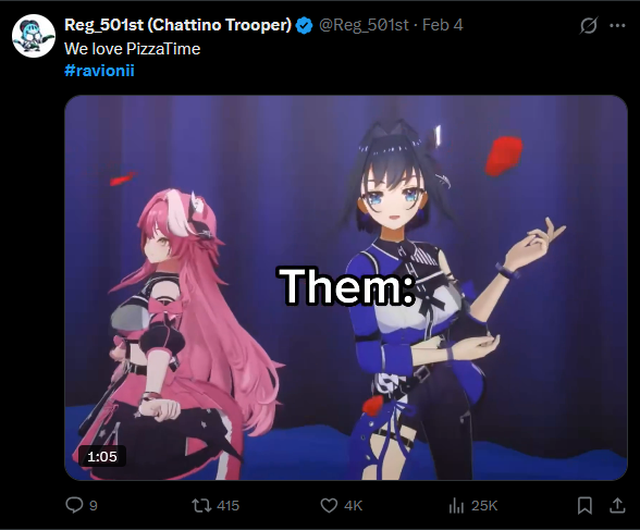 >>109286841>Kronii said her off-collab with Raora that if she keeps fooling around Raora is going to sleep on the couch. Raora looks at her and asks her what she said but Kronii doesn't have the heart to tell her. Kronii is so embarrassed by this and she attempts to turn off her chat monitor. Raora finds out context from chat and starts talking about how Kronii's bed is so comfortable and Kronii folds immediately>Kronii and Raora were folding laudry together whilst there was a tv show playing in the background (married couples do this) and in their recent powerwash collab they both talked about their pension plans (married couples do this)>Kronii asked Raora her forbidden question and Raora's answer was so unhinged that Kronii let out a huge belly laugh as Raora answered in great detail>Kronii asks Raora for an exclusive experience and offers to pay Raora along with some "extra benefits">Kiara confirmed that Kronii and Raora were close during AFO with Kronii confiding with Raora>Kronii specifically requested that Raora draw art of both of them living together still youthful and enjoying their pension together>Kronii talked about how her family loves Raora's pasta sauce and how they all had a pasta party with it>Raora was talking about going glamping with Kronii and Kronii also chimed in saying they can go take a dive together whilst they were at it>Raora asks Kronii if she loves powerwashing, Kronii answers yes and Raora tells Kronii that her dad has a powerwash in italy and they can both powerwash together>Kronii said I love you to Raora once and Raora got stunlockedPizzaTime PizzaTime Pizza Pizza PizzaTime