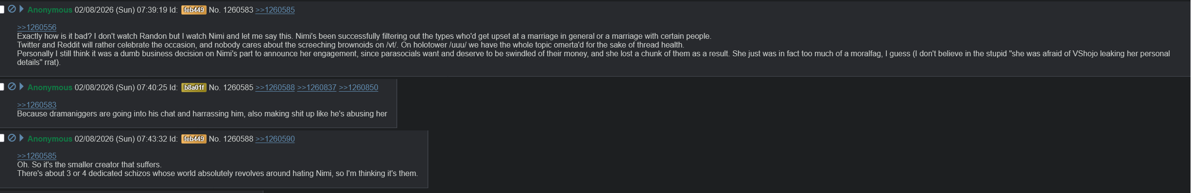 >>109303084>>109303123No, it's a shit thing. Nimi should be rewarded. Hopefully she doesn't get hurt by her secret coming out. Now, someone who 100% deserves it is Saba, I hope we find proof of her relationship and I'll be the first to spread it everywhere