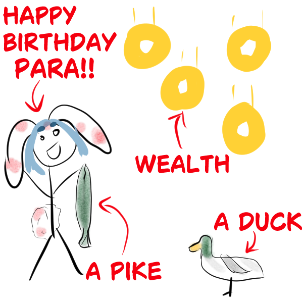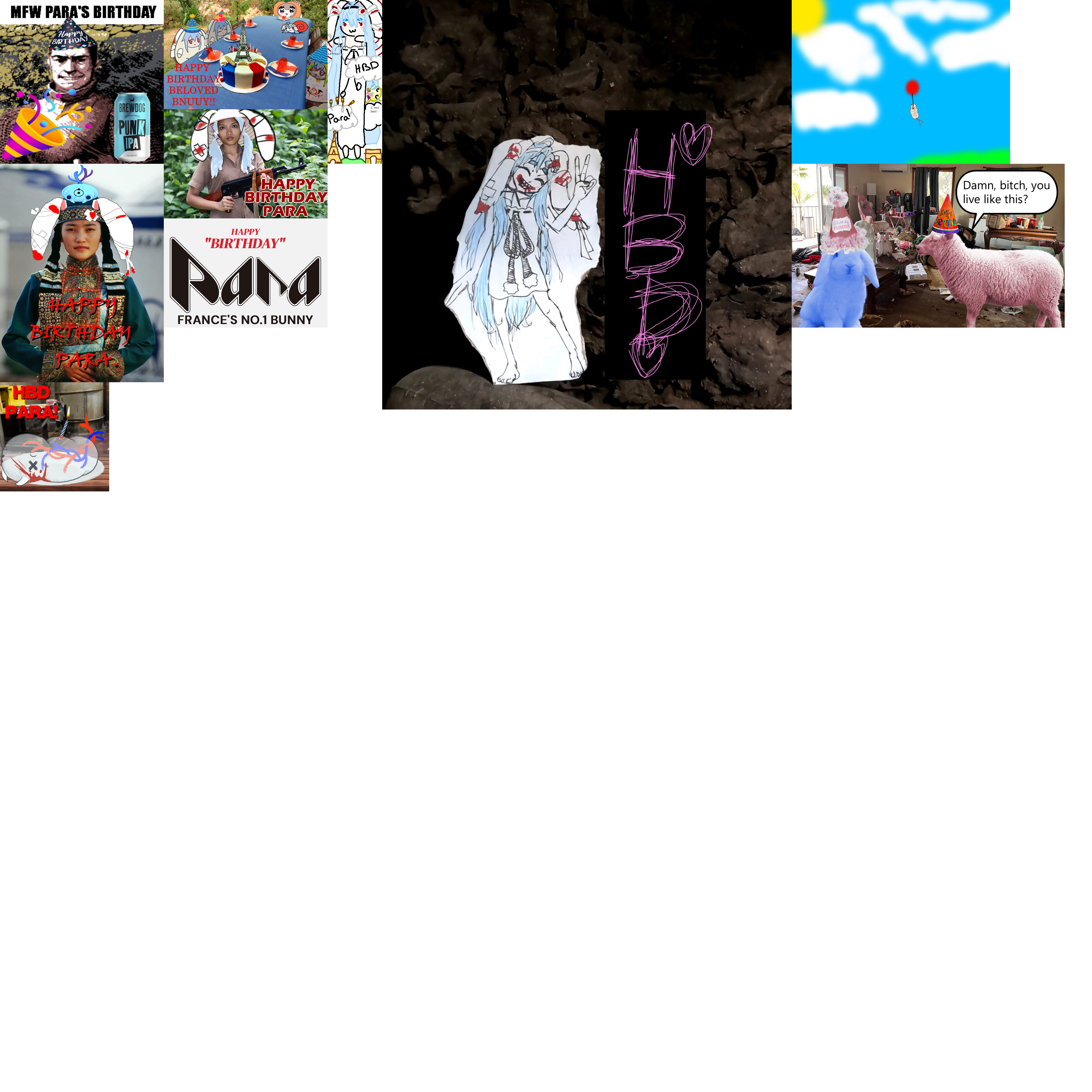 In 6 hours it'll be Para's birthday, show your appreciation by contributing to her birthday card! Standard card rules apply: submissions must be SFW and have image dimensions that are a multiple of 200 (i.e. 200x200, 400x400, 200x400). Submissions close at 1am EST the day of so please try to get your tile in by then.Model references:https://files.catbox.moe/c5p06b.pnghttps://files.catbox.moe/64pg23.pnghttps://twitter.com/wwparasiVT/status/1747075143430529457https://files.catbox.moe/yz83tj.pnghttps://files.catbox.moe/gisk2d.pnghttps://files.catbox.moe/o49h5j.pnghttps://mega.nz/folder/d28SUKQB#jtLoV8sDAUfQYFgow4yPvwKoikatsu card:https://files.catbox.moe/nkuosa.pngSome of Para's hobbies/interests for inspiration:>Her friends (non-inclusive): Essie_ch (her oshi), Krumroll, Kibawoo, Kikitchiwi (french), Miaelou (french), Rimaeri, Gloomi>Guro and grotesque things in general>Touhou (Cirno, Reisen, Flandre, Remilia, Tewi)>Meat (raw or rare) and food in general. She cooked beef tartar and sheep brain on stream.>Drinking beer (her favorite is Asahi (also french beers)) and tea>Drawing>Rioting (she used to run from cops?)>Drunk driving>Bunnies and sheeps>Playing guitar (and singing)>French culture>Insects (beetles, maggots?)>Movies (avant-garde, Takashi Miike, japanese movies)>Games (rhythm, half-life, dusk, silent hill)