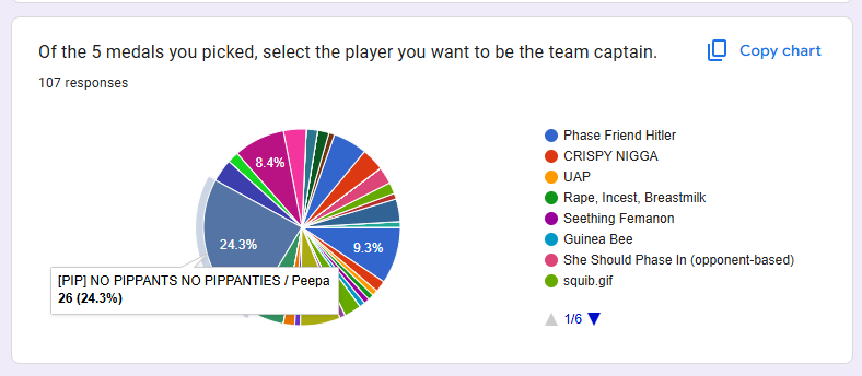 >>109309002And the captaincy vote is another win for NO PIPPANTS NO PIPPANTIES, which also confirms the second gold status of Autism Creature.Results:https://docs.google.com/forms/d/11nR1Vv2Pl5JgSutXP6aEzj3gIlrULnhpXtYuyccAFzU/viewanalyticshttps://docs.google.com/spreadsheets/d/1XVC9_Yrq30-6yBSin5dth32KCyRaztB51xMDgeiEiek/edit?usp=sharingNow, for the elephant in the room.The last 12 hours of the poll were marked by heavy and decisive liker brigading, with 30-33 votes out of the 107 total. The most obvious impact was single-handedly taking Autism Creature from outside the roster into second gold status, and not even the top 11 rule for medal eligibility was able to placate it. The last known status before that (I would have to do a manual recount to confirm this so take with a grain of salt) was something like Pippa and Panko golds (like last season), Hitler, Lumi and Jerry silvers (with Hitler dangerously close to failing the top 11 rule, which would've given Crrroc the medal instead), as well as Sleepy and Ember being kept in the roster (and Shiina getting in) over Michi, Lia and Yuu.