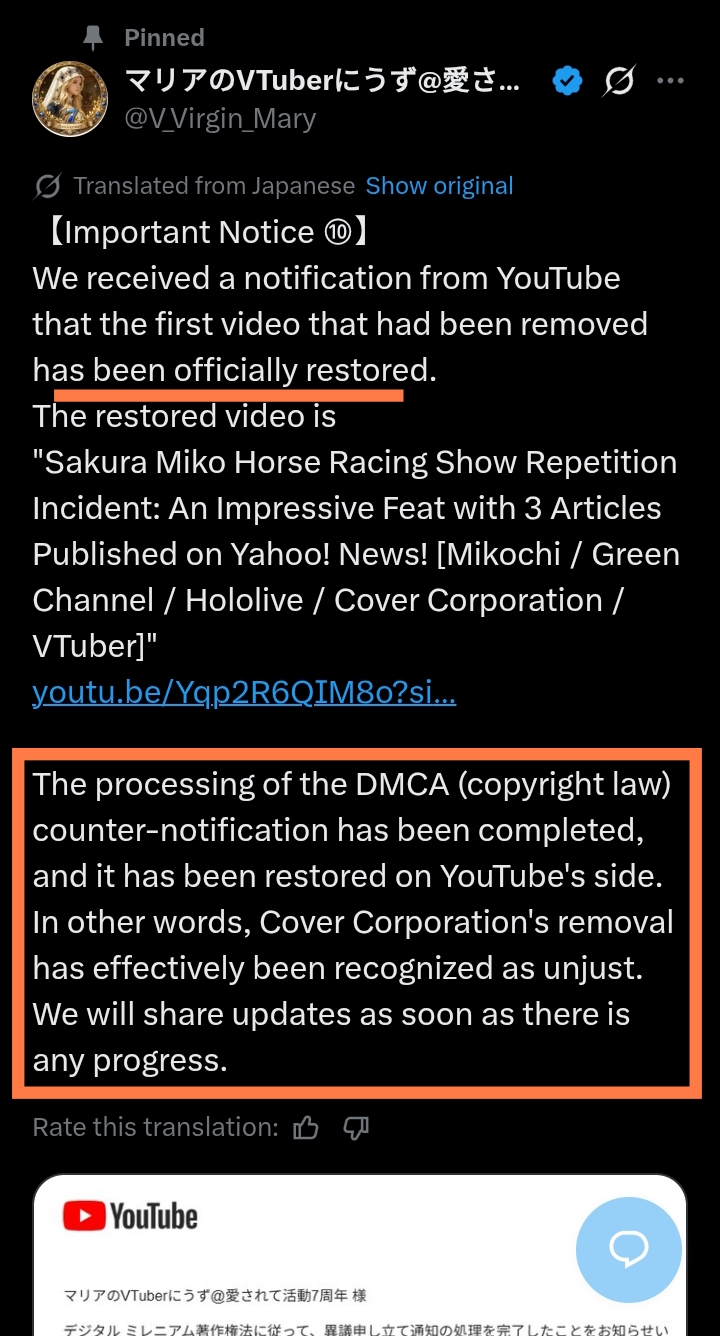 Oh no! A multi billion dollar vtuber company just lost a DMCA battle to an AI slop account. https://x.com/V_Virgin_Mary/status/2020271426960519369