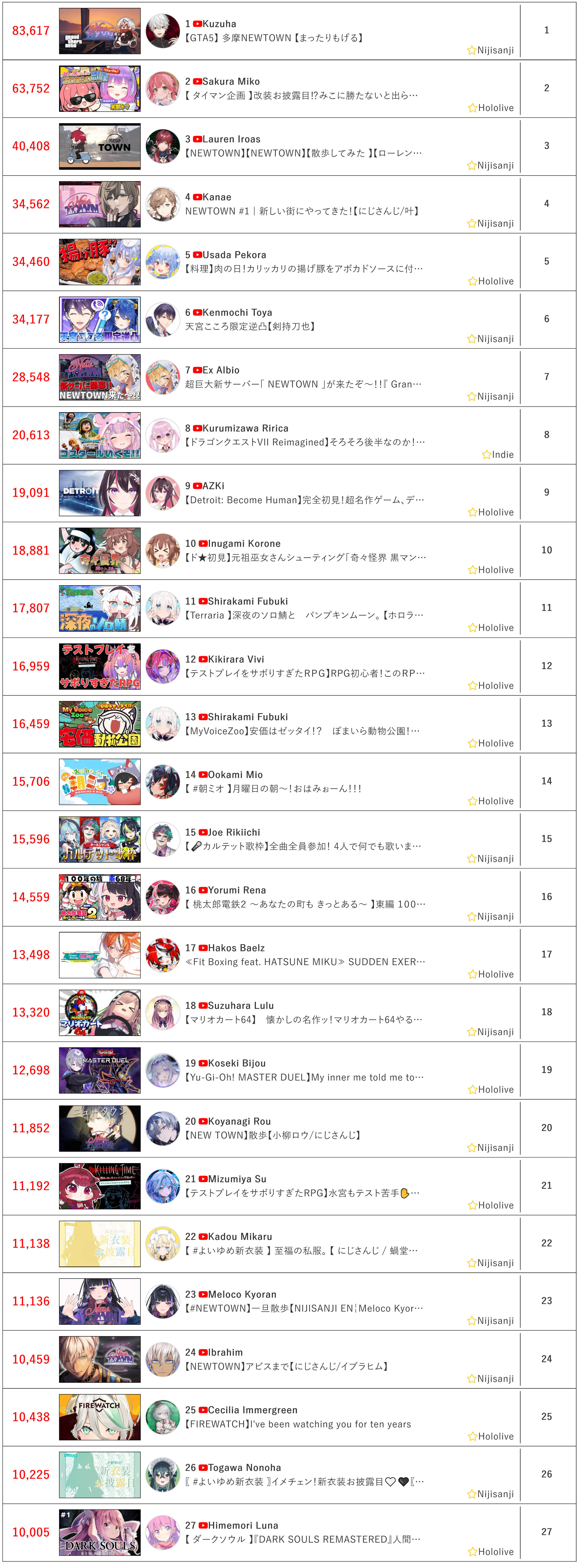 *GENERAL NUMBERFAG SITES*>https://playboard.co/en/>http://ikioi-ranking.com/>https://vrabi.net/>https://live-ranking.userlocal.jp/vtuber-rankingHololive sites>https://www.hololyzer.net/youtube/index.html>https://trackholo.live/en/>https://holo-spotify-stats.jirikunes.eu/Twitch>https://sullygnome.com/>https://twitchtracker.com/>https://stats.roki.sh/>https://streamscharts.com/