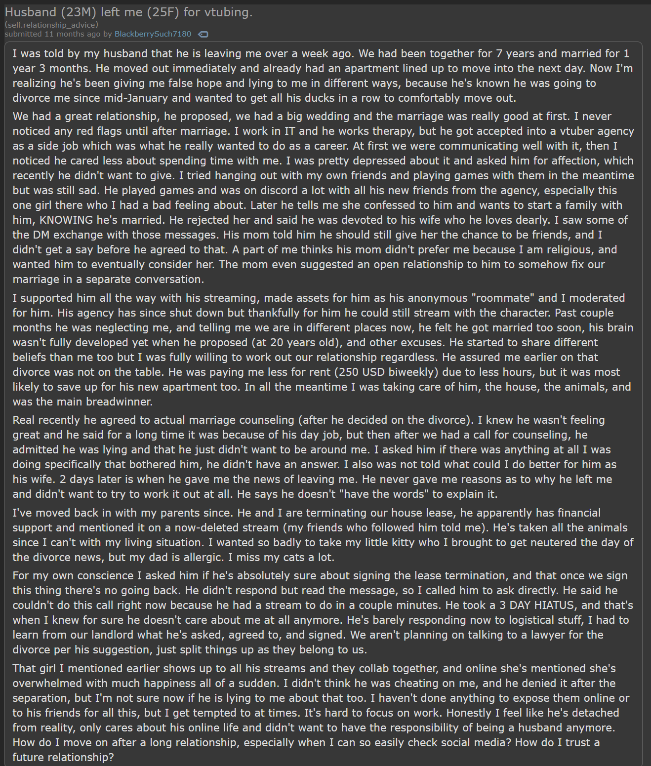 >>109323923I remember reading this exact same post, but it was a woman that was the vtuber and she was dropping her husband for a viewer.
