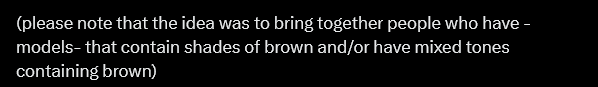 >>109327888>>109327911Doesn't she have tons of models? Surely some of them are brown enough for this