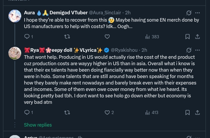 >>109338935>2%I don't know why you retards settled on this number, the original stream where Mysta talked about their cut was ONE percent.>>109339732Most people don't actually read the financial reports. Some juicy facts can come to light.Last spring, Cover's first report of the year said tariffs reduced their EN merch revenue by nearly half(an estimation of around 1b yen in a single quarter). In the same report they mentioned they were already starting to see a recovery, likely due to slight changes in their merch production(i.e. not having all of the stuff made in China, or the somewhat recent flat shipping rates). This means that HoloEN earns them a MINIMUM of 4x more than NijiEN's entire revenue stream from just merch sales. Another way to phrase this: HoloEN earns in a single quarter, from merch alone, what NijiEN does in an entire year. With half of the VTubers. And unlike in Nijisanji, multiple Hololive talents have commented that they get a significant cut from merch sales, especially if they help design or front some of the cost towards designing/producing merch(upwards of a 90% cut).
