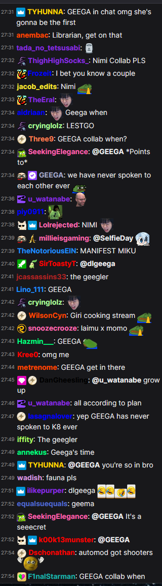 Yesterday Geega said she wishes that her viewers typed more. She said that doesn't want them to feel like they're spamming if they're talkative in chat.