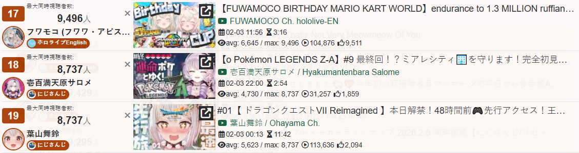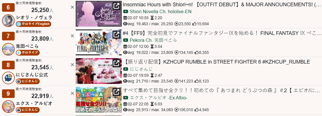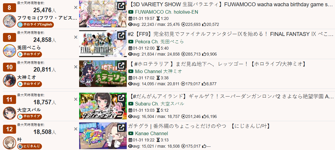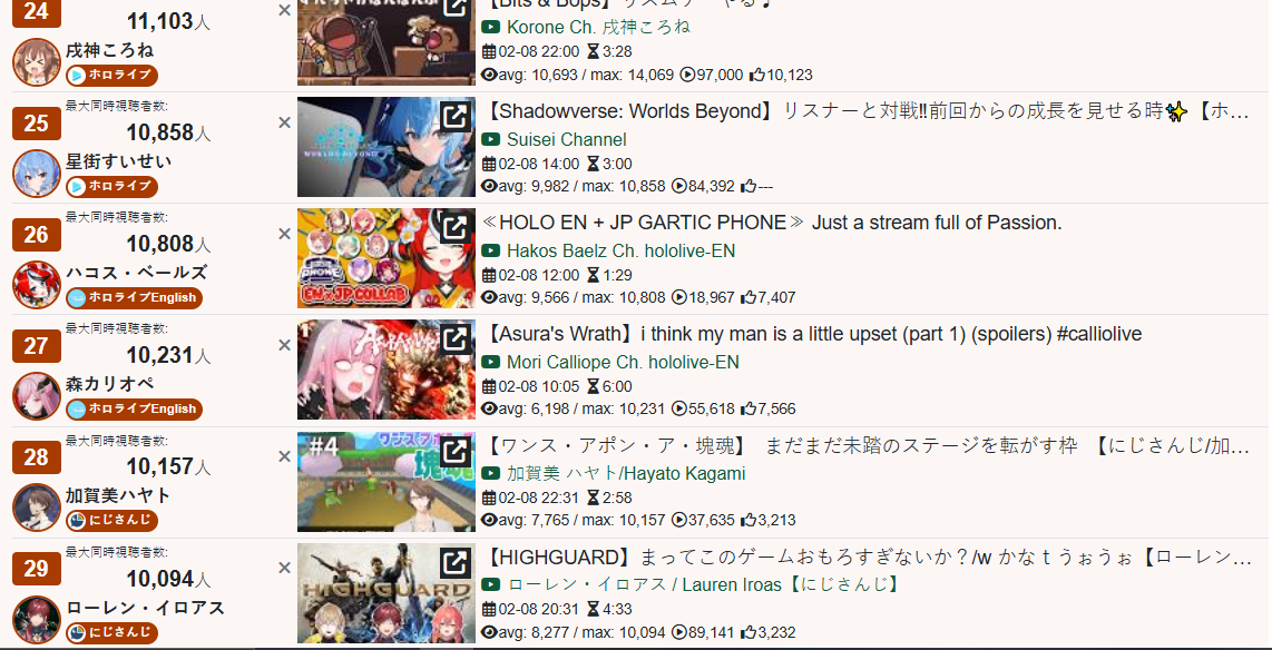 *GENERAL NUMBERFAG SITES*>https://playboard.co/en/>http://ikioi-ranking.com/>https://vrabi.net/>https://live-ranking.userlocal.jp/vtuber-rankingHololive sites>https://www.hololyzer.net/youtube/index.html>https://trackholo.live/en/>https://holo-spotify-stats.jirikunes.eu/Twitch>https://sullygnome.com/>https://twitchtracker.com/>https://stats.roki.sh/>https://streamscharts.com/