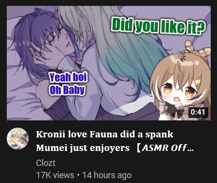 >>109355892>I understand Kanata situation more and more and listen Towa told us about this really make my blood boil..Kronii love Fauna did a spank Mumei just enjoyers