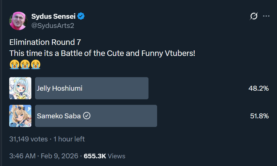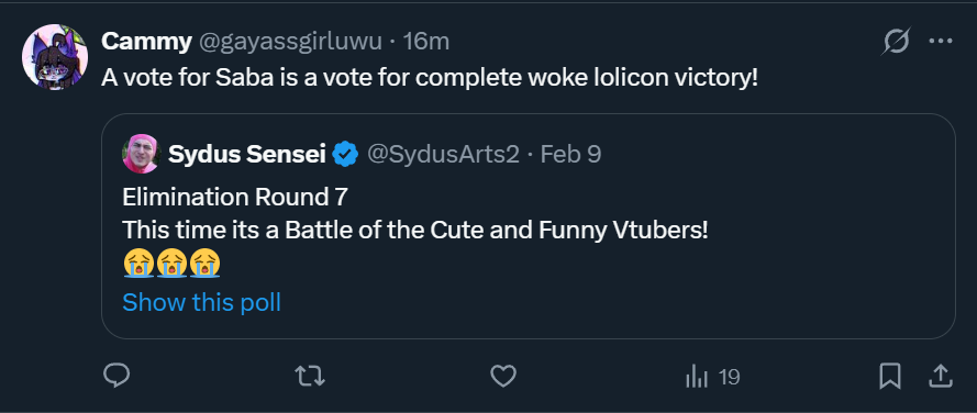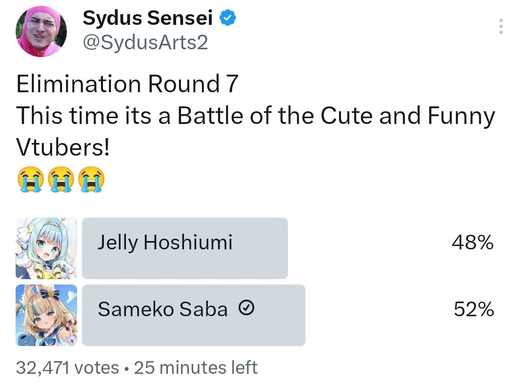 >>109354653for you this random fanart poll from some guy was an existential struggle of grave importancefor kaniki this was just tuesday nigga, "oh look, a poll with saba's name on it, *click*"I guarantee most voters didn't even register who the other vtuber was