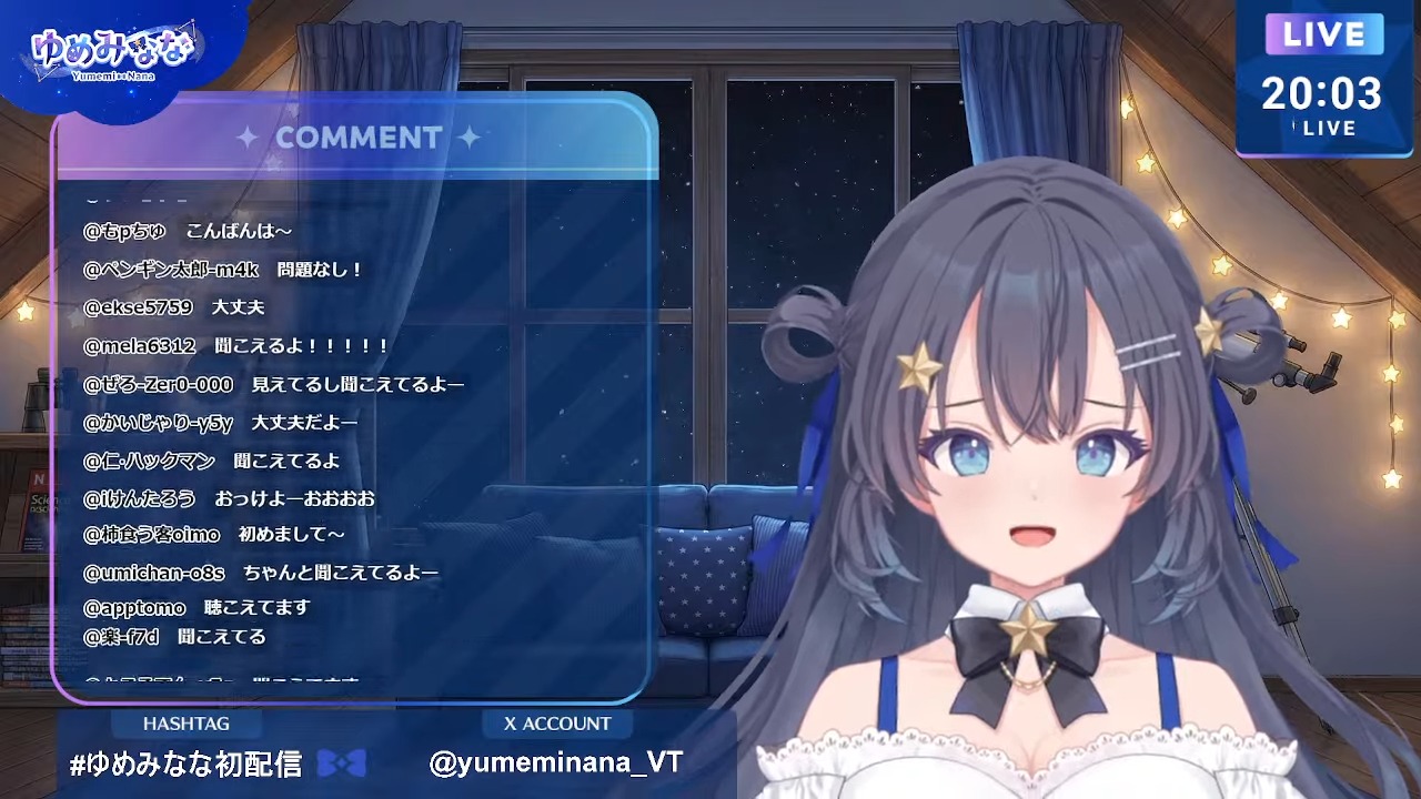 Yumemi Nana's Debut Stream.https://www.youtube.com/watch?v=YX_r9mz7skYWarning: She's an AI Vtuber.
