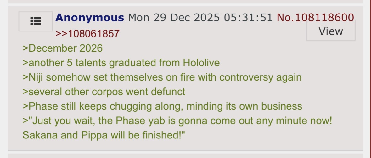 >>109359898holy shit, and it's true, Phase is still doing what it does best, just minding their own business.The Hololive thing, I'm not so sure, but who cares, it's not like I watch them.