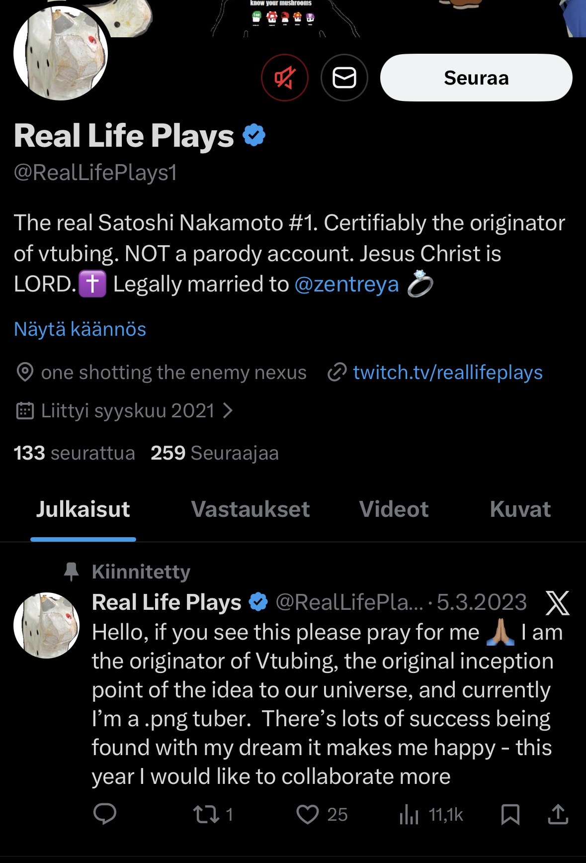 Hey everyone!I’m just posting this to give everyone here a heads up. Zentreya is being harassed and stalked by someone named Vincent. The reason I’m posting this here because he is extremely active here. Many of you probably already can figure out that this person is not okay in the head. He seems to suffer from Delusions of Grandeur.He claims Marriage to Zentreya, creation of VTubers, ownership of VShojo IP, co-creation of Twitch and many others. But his primary focus is Zentreya.You may have spotted him here posting all sorts of stories under the name None.He does this same narrative on X with the handle @RealLifePlays1 and on twitch he rebroadcasts Zen under RealLifePlays.He is not, I repeat, NOT married to Zentreya. Though it probably is obvious to many by now.This same person has also attempted to trademark VTuber twice unsuccessfully, first in 2023 and then in 2025.He is still actively continuing his behavior to this day. I don’t know if Zentreya is aware of them or not.So if you spot anyone claiming connection between Vincent and Zentreya or Vincent and creation of VTubers that’s them.