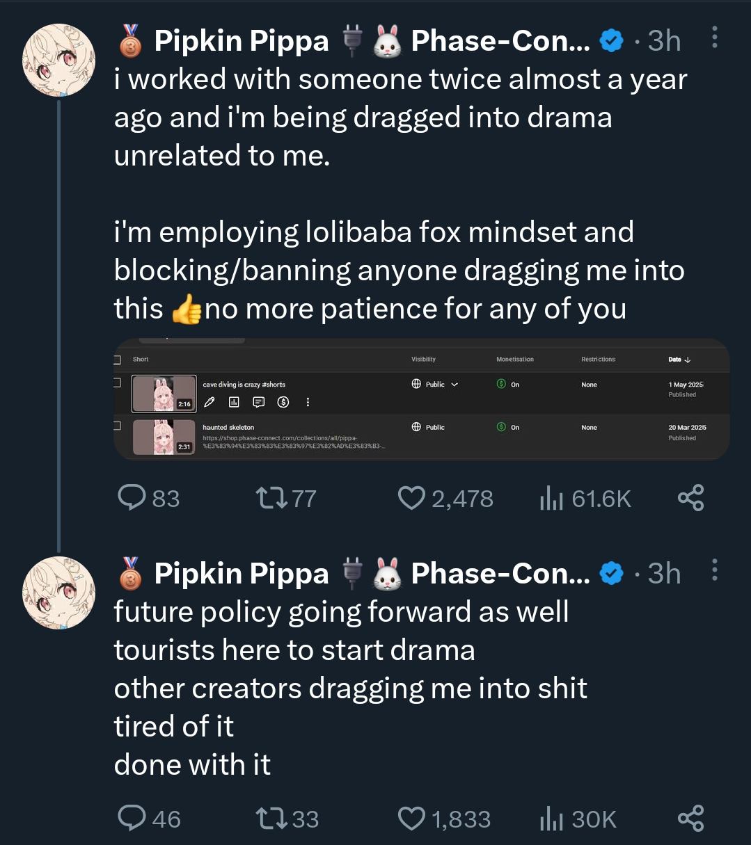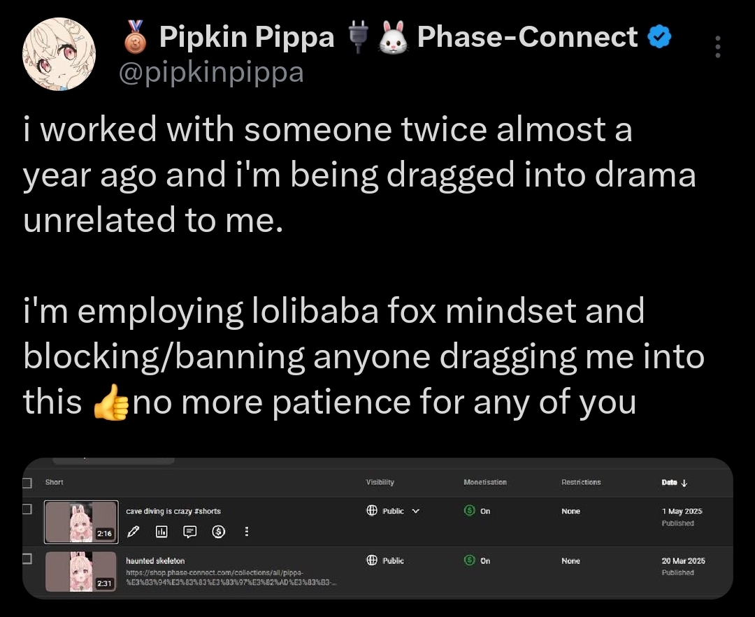 >>109371325Depends what Jelly's announcement is.If it's a graduation then Phase is dead, if not then the drama should fade after Jelly's return