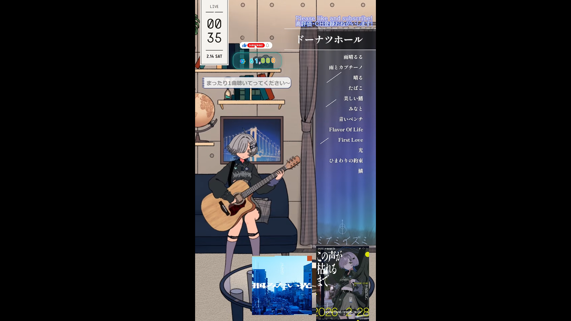 Song Frames and Special EventsVirtual Obaachan Heisei Shamisen Song Frame?https://www.youtube.com/watch?v=4L1DprPnh-YFigaro Valentine Song Framehttps://www.youtube.com/watch?v=NHBjGX1vWqUEnma Ruri shortshttps://www.youtube.com/watch?v=ASrkCQNWc7AKasumi Hibiki DAY 3https://www.youtube.com/watch?v=MheJkr1cgAYOtodama Hibiku again w. 10 mins left shortshttps://www.youtube.com/watch?v=fGzfPGn0KpwAmazura Sumoa x IMIhttps://www.youtube.com/watch?v=oJwmZKuVyZkNoa Polaris 1 hour song framehttps://www.youtube.com/watch?v=HgTo_y6ObAQ