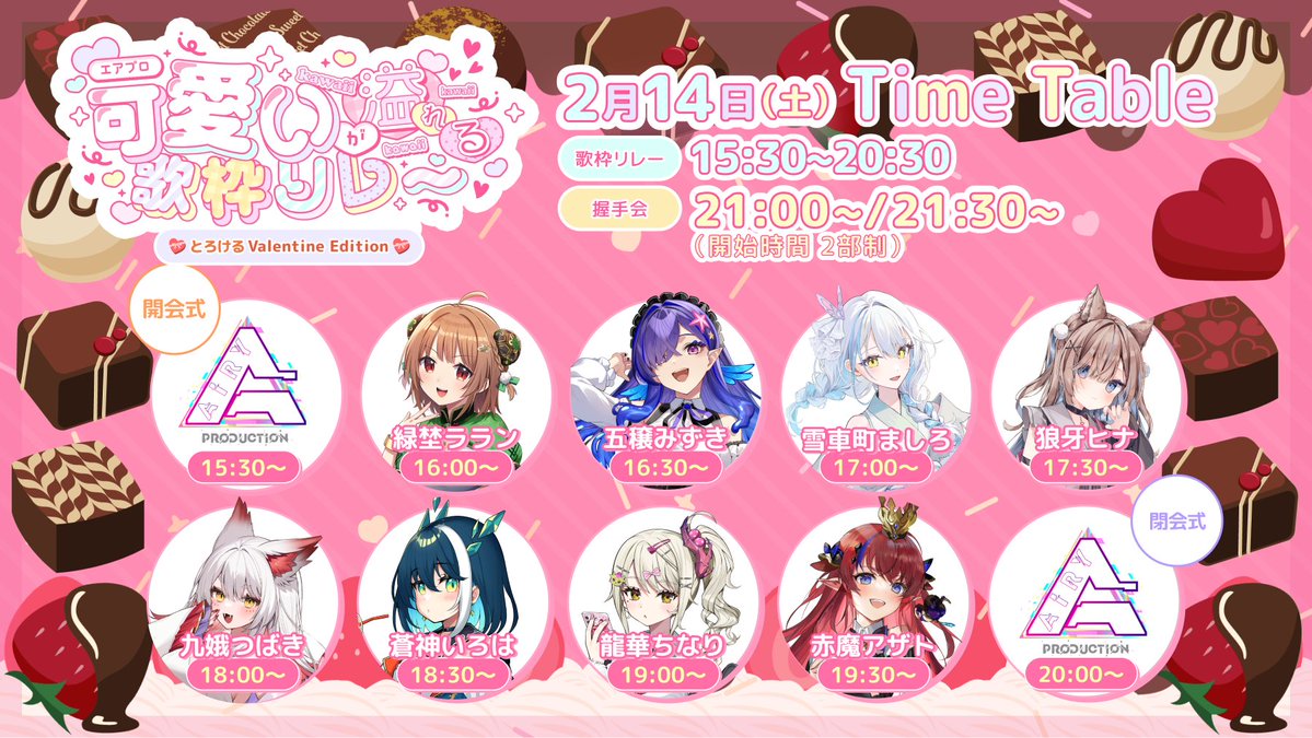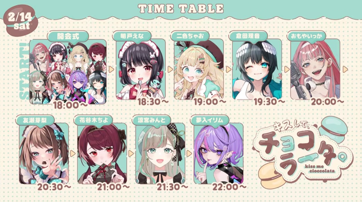 Valentine's Song Frames and Special EventsYuzuki Choco 3D Birthday Livehttps://www.youtube.com/watch?v=_1PGuuEP7psSophia Valentine 3D Birthday Live Choco Paradise https://www.youtube.com/watch?v=t9FYdBKZKqcSoraduki Tyrahttps://www.youtube.com/watch?v=QWQntFeamrIYachi Honokahttps://www.youtube.com/watch?v=pYvpWrjeLPoHaruka Mikoto shortshttps://www.youtube.com/watch?v=PXtJYJ55I3cKamiya Harukahttps://www.youtube.com/watch?v=bbDZWWpq0RcSakurane Kotorihttps://www.youtube.com/watch?v=wQdUIu23ytw