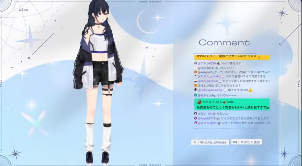 Song Frames and Special EventsKisara AYAKAKI 3D Debuthttps://www.youtube.com/watch?v=BQY_LRTObfMLetora Utagawa 40K Celebration 3D Livehttps://www.youtube.com/watch?v=opkpPHWyalEFelicia New Outfit Revealhttps://www.youtube.com/watch?v=SLaGxG4eFSsKasukane Shino 3D Acoustic Guitar Frame Aftertalkhttps://www.youtube.com/watch?v=3k1-aa4MMXcShirane Yuki 3D Debut Announcementhttps://www.youtube.com/watch?v=2oaPo0e9LiEMomose Nina 37K endurancehttps://www.youtube.com/watch?v=r7Mzr6kvzJcYumekawa Kanauhttps://www.youtube.com/watch?v=yJ_p9HacUnYJabi 80 ccv endurance shortshttps://www.youtube.com/watch?v=5m9wuPnBK0k