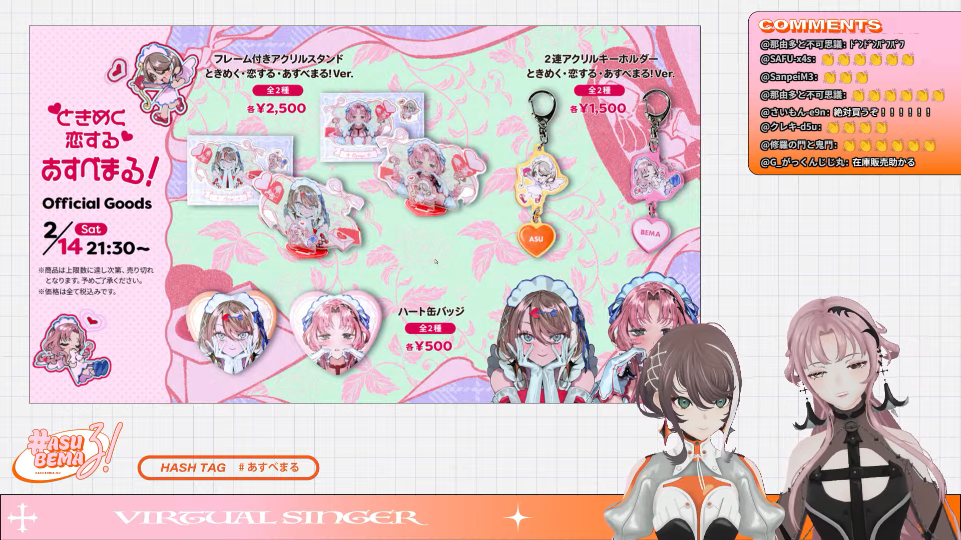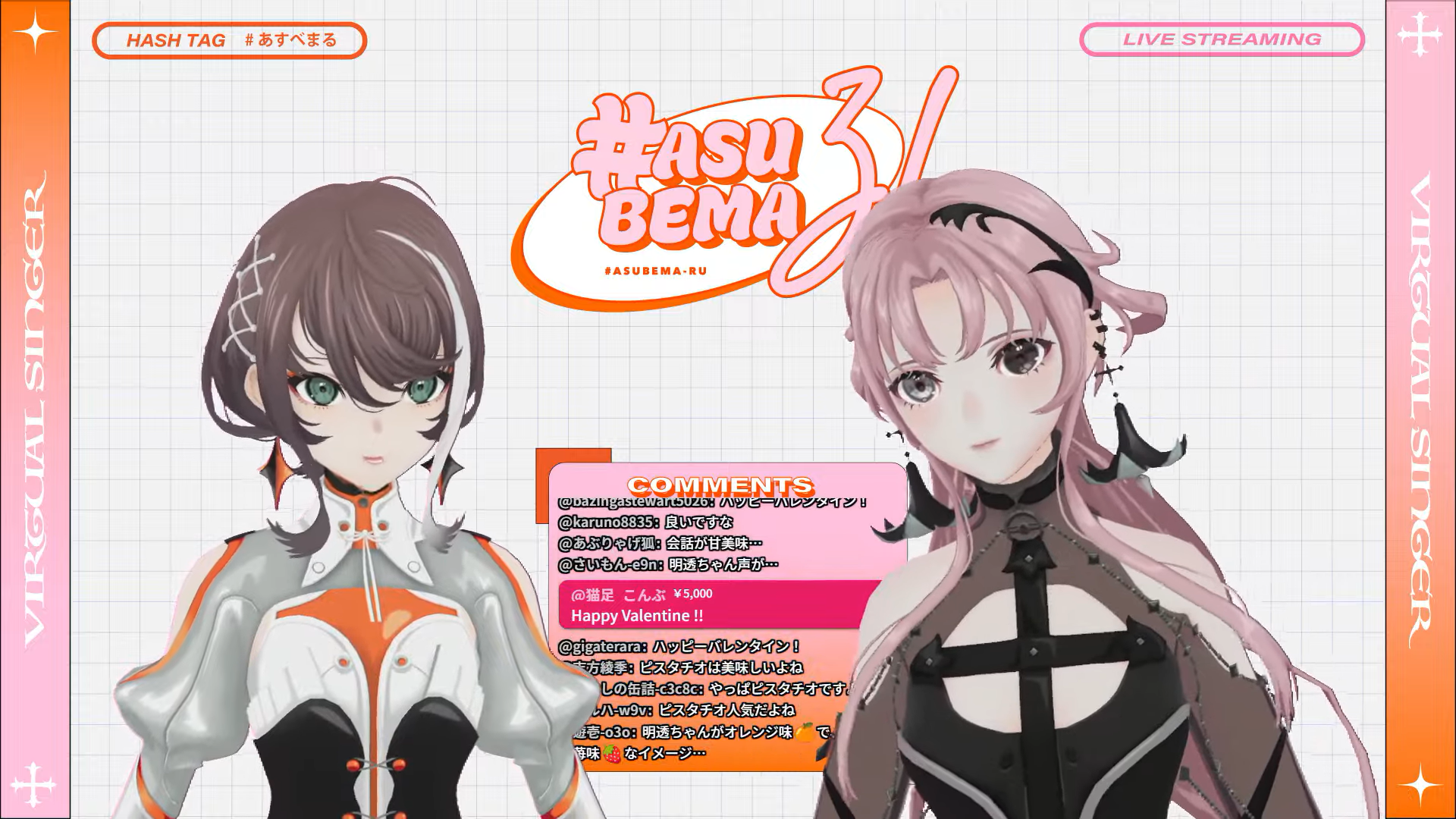 good night, /vsinger/tonight, i will dream of the time between the LLL roster being teased then fully revealed getting shorter and shorter, lots of Valentine's Day song frames, eating KAF's chocolate, wishing Yomi and Kasuka would use the old models again, JP GTA RP servers blowing up VSingers, and ASU and BEMA talking about loveHappy Valentine's Day!