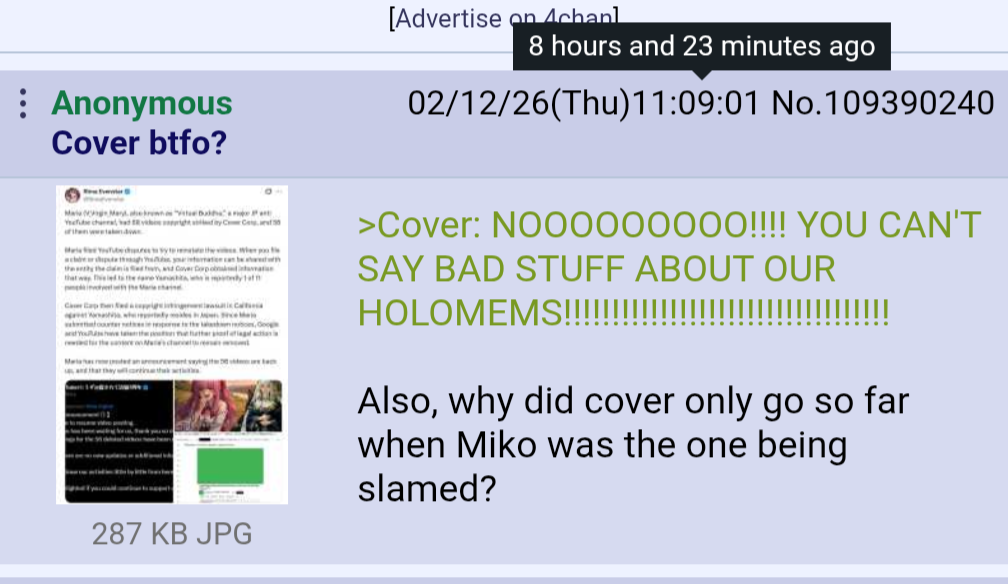 >>109400848Others, sure. On the other hand, this particular guy likely will settle with Cover behind the scene instead of heading to court and I'm pretty sure one of the clauses will be to stay the fuck away from drama peddling against Hololive