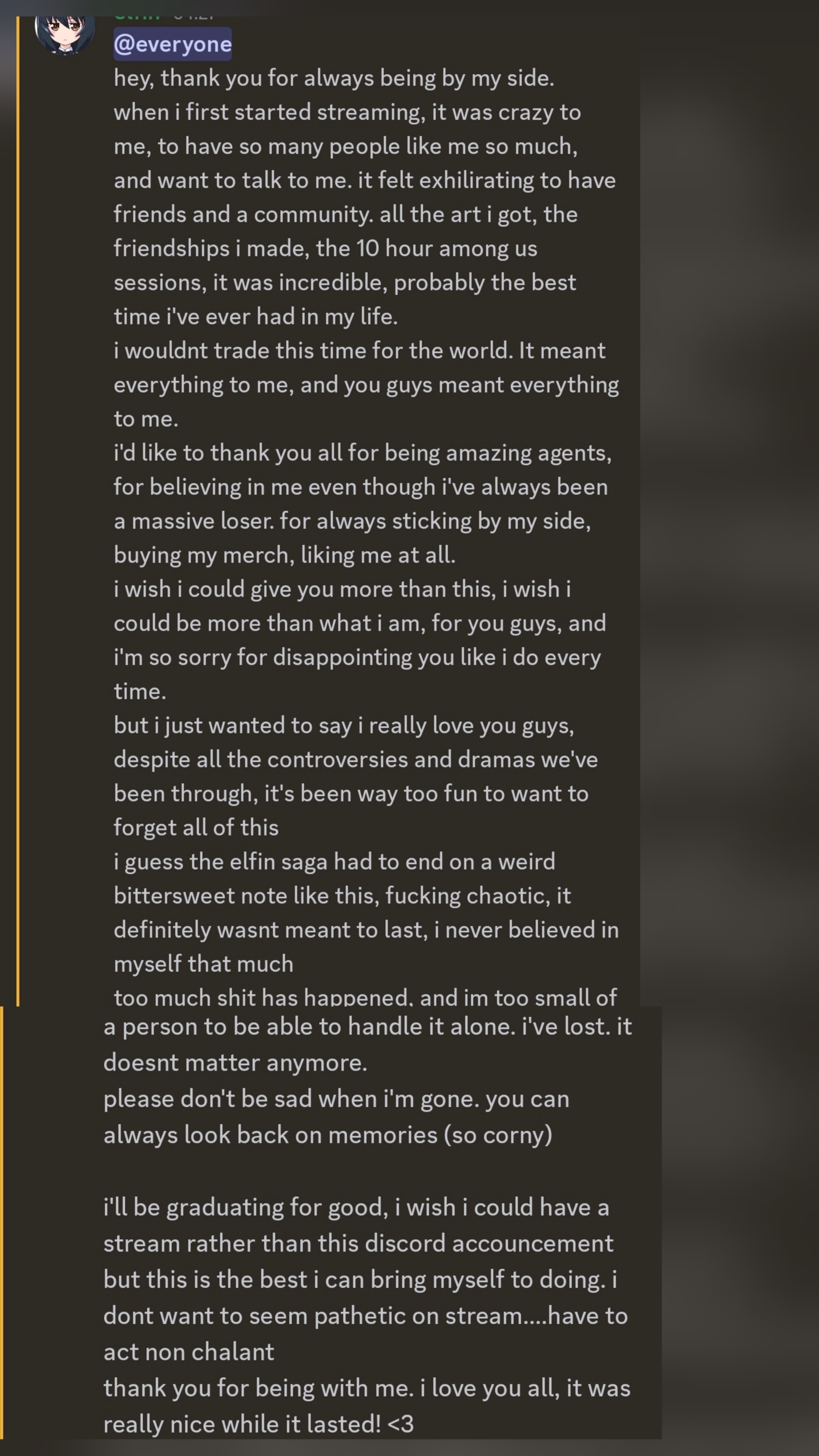 Has any ligger, after announcing hiatus on twitter, made a farewell stream (even short)?