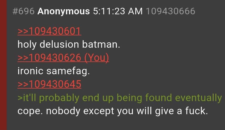 >>109430601holy delusion batman.>>109430626ironic samefag.>>109430645>it'll probably end up being found eventuallycope. nobody except you will give a fuck.