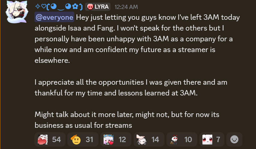>>109430758Since we're at the end of this thread anyways i'll go ahead and engage under the assumption of good faith on why the 3am stuff happened. We don't know specifics but we know 4 member left last week at the same time, and 3 of them cited issues with their manager mr. XLR, basically implying he was incompetent and fumbled sponsorship opportunities for them. In Olivia's case however she left before the 3 others were originally planned to leave and cited her personal health and the health of her family as primary cause. I don't know where the person you replied to that said it was sponsorsharing related got that, nobody ever said anything about that or indicated as much.From what we can tell Fang and Isaa wanted to focus on music related projects but 3am did not have the ability to support such projects accurately, with Isaa herself flat out stating in a stream this week she was more or less dragging anything music related along by herself. Fang was on the hook for a music video that still hasn't released. She claimed there were production issues and she ran that project herself and that the manager XLR has it but it is currently unreleased. Lyra who left alongside this group made no statements but she is good long time friends with Isaa and likely left out of solidarity.That's about the bulk of what we know, but by most indications the majority of everyone left on good terms with one another and have stated as such with former members of 3am still collabing with current ones earlier this week and planning trips together and such.