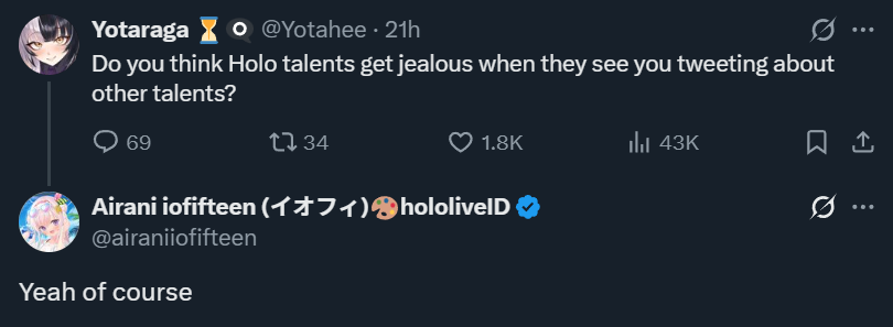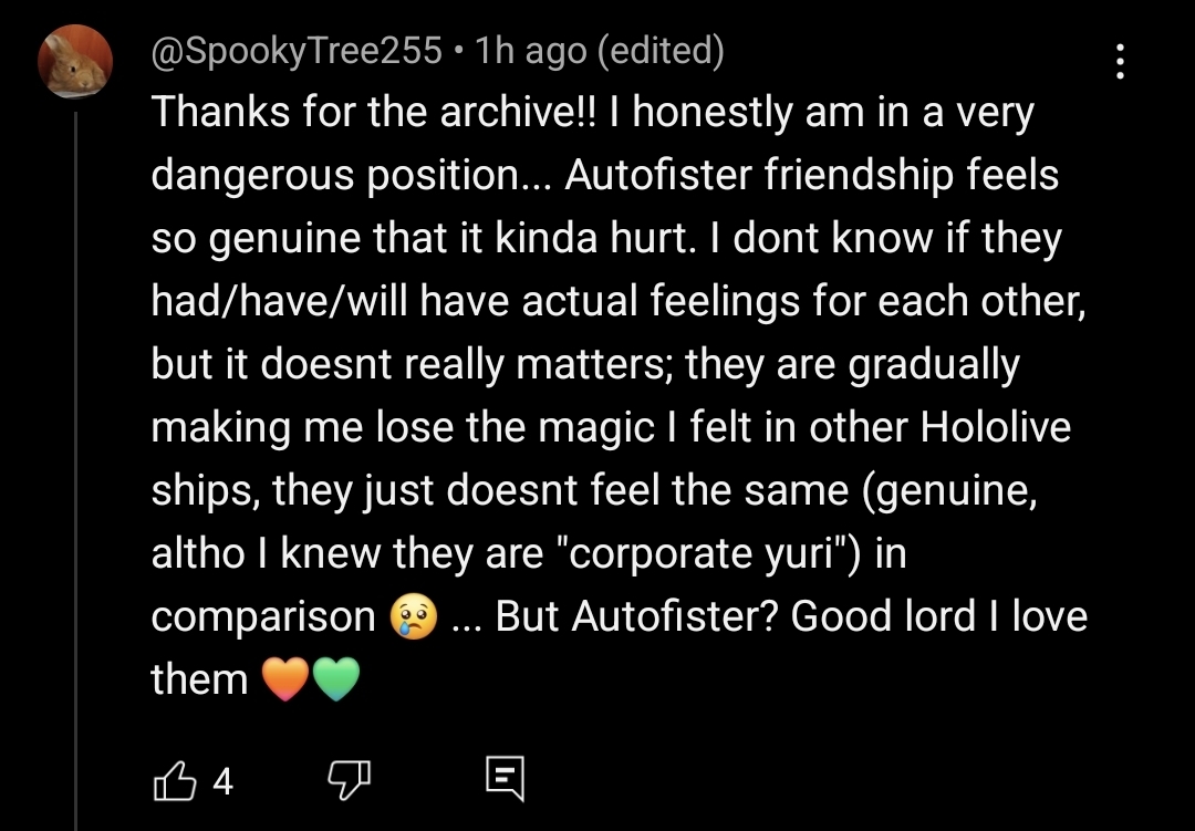 >>109432151I mean she said she's jealous of other more popular Vtubers/members and their opportunities but also happy that she's not as stressed so there are positive sides of being the least popular hololive member!