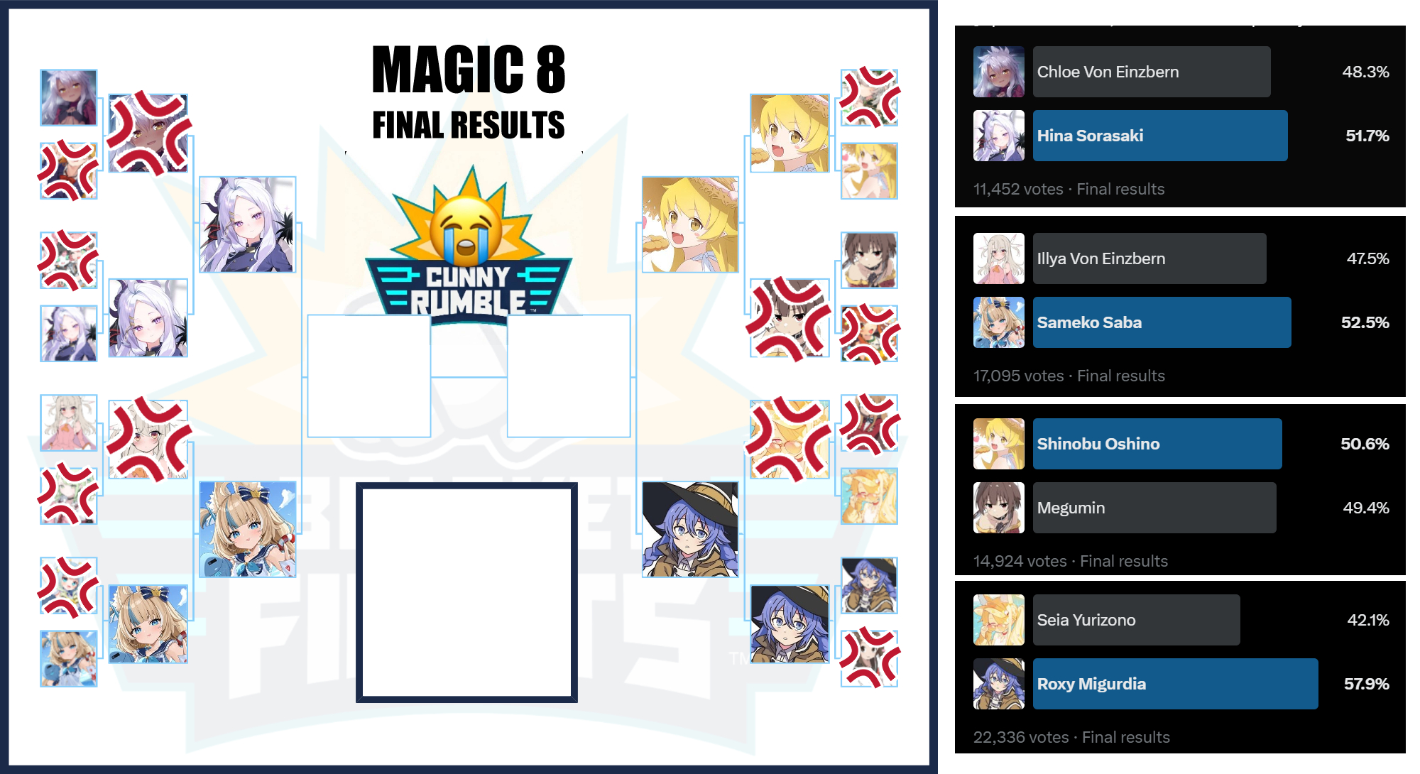 >>109431813Wait, Saba won against fucking Illya. Jesas, next you'll tell me she can beat any of the remaining three. Bunch of retards.