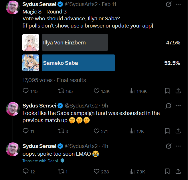 >>109431956It’s obviously that the poll/pollster is only being seen by vtubing fans/adjacents cause even a partial outbreak into the public at large would have Illya dominate, let alone the other two that Saba will be up against who should realistically 90/10 her ass.