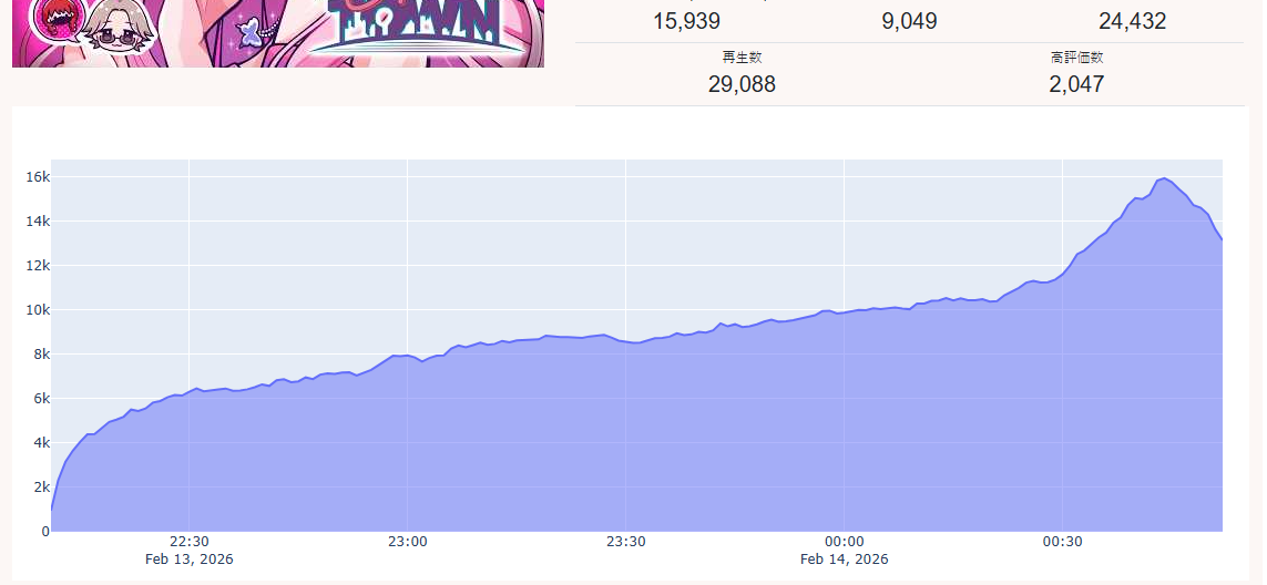 *FEBRUARY 13TH 2026 FINAL EN TALLY*>16,050: Gigi (Hololive English)>8,914: Calliope (Hololive English)>8,909: Calliope (Hololive English)>6,466: Baelz (Hololive English)>5,428: Shiori (Hololive English)>5,304: Clio (Phase Connect)Alright, good tally overall. Gold for Gigi Murin (alongside Cecilia Immergreen) self booth 3D karaoke, Silver for Mori Calliope's playthrough of Asura's Wrath, Bronze for Mori Calliope's watchalong of State of Play.NOTICE: For this day on, a new criteria of classification will be added to the English Tally. Apart from having at least 5,000 peak CCV on the day, at least a 10% English Chat Ratio (which you can check in Hololyzer) will be needed in order to qualify for the EN Tally, otherwise, it will be considered as if the talent had not qualified for the tally.You need to speak English to be on the English tally, don't you?>RANKING PER POINTS (Gold = 3, Silver = 2, Bronze = 1)Baelz = 17pBijou = 14pCalliope = 6pGigi, FUWAMOCO, Elizabeth = 5pRaora, Meloco = 4pIRyS, Ina'nis, Saba = 3pCecilia, Shiori, Nimi = 2pKiara = 1p