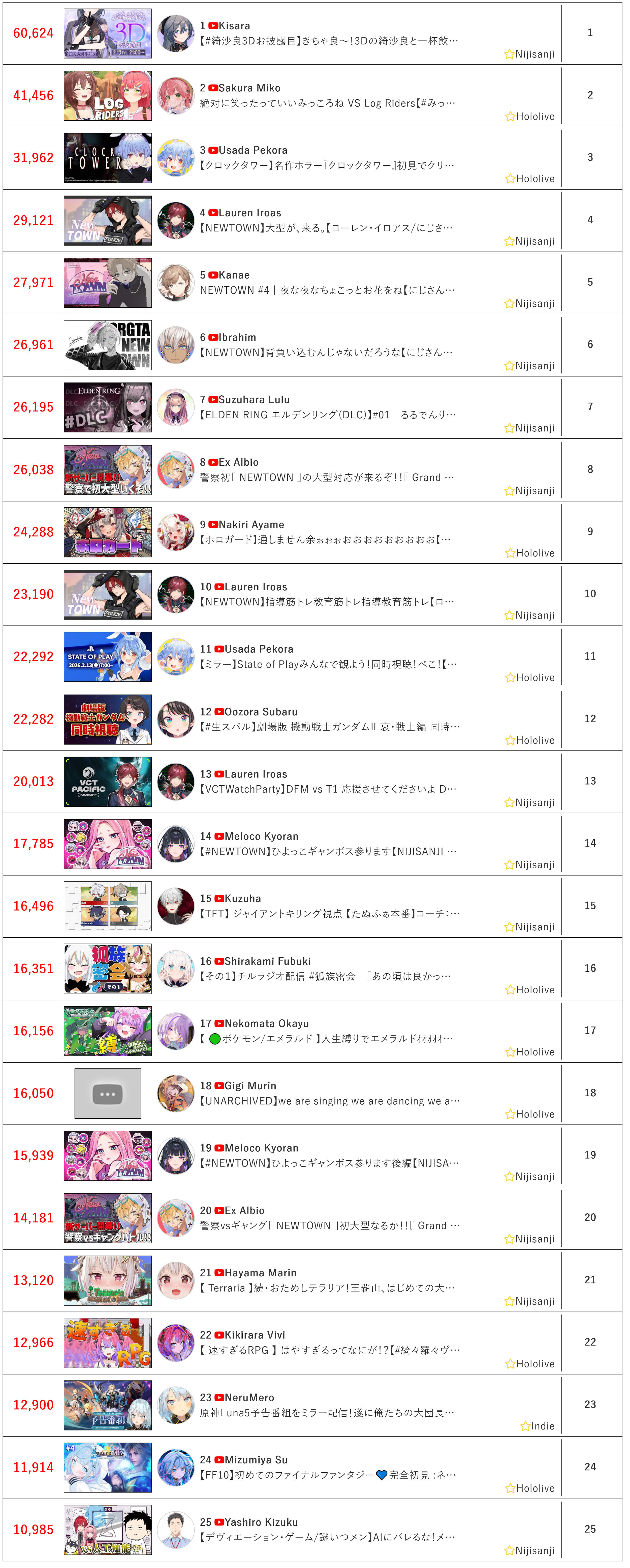 *FEBRUARY 13TH 2026 FINAL EN TALLY*>16,050: Gigi (Hololive English)>8,914: Calliope (Hololive English)>8,909: Calliope (Hololive English)>6,466: Baelz (Hololive English)>5,428: Shiori (Hololive English)>5,304: Clio (Phase Connect)Alright, good tally overall. Gold for Gigi Murin (alongside Cecilia Immergreen) self booth 3D karaoke, Silver for Mori Calliope's playthrough of Asura's Wrath, Bronze for Mori Calliope's watchalong of State of Play.NOTICE: For this day on, a new criteria of classification will be added to the English Tally. Apart from having at least 5,000 peak CCV on the day, at least a 10% English Chat Ratio (which you can check in Hololyzer) will be needed in order to qualify for the EN Tally, otherwise, it will be counted as if the talent had not qualified for the tally.You need to speak English to be on the English tally, don't you?>RANKING PER POINTS (Gold = 3, Silver = 2, Bronze = 1)Baelz = 17pBijou = 14pCalliope = 6pGigi, FUWAMOCO, Elizabeth = 5pRaora, Meloco = 4pIRyS, Ina'nis, Saba = 3pCecilia, Shiori, Nimi = 2pKiara = 1p