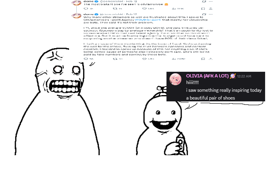 >>109450938it was sheer delusion. deme is dunking on us, everyone thinks we're just racist supporters of fallenshadow and olivia is getting dragged into it. i can't imagine it was shondo's intention to bring down a racist horde on deme, but she's going to take full advantage of it as a graduate of tectone's college of streaming.