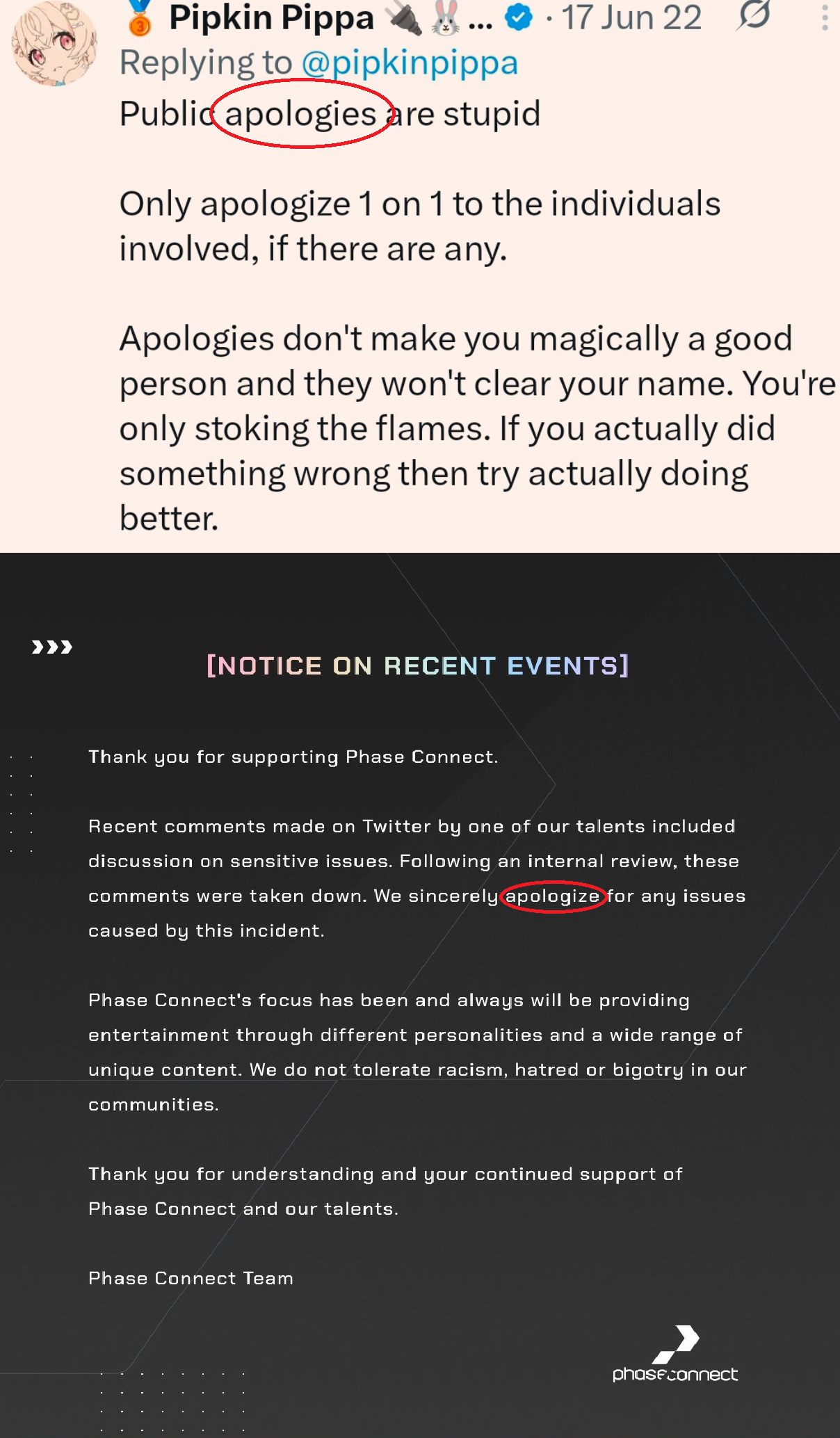 >>109459136Ironically, what she said here actually happened on both fronts. Phase apologized and Sakana also apologized to Jelly behind closed doors.