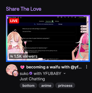 I know Valentines is tomorrow, but start thinking about Easter themes. I know some of you are vtubers lurking, or at least managers. Spring celebrations are fun. If you're looking for discord movie watch alongs try blade runner. If you're looking games try Alice Madness Returns. If you're looking for something to cook for a cooking stream try Finnish fish soup. The light colors of the soup remind me of spring. Ask for crafting streams try building a planter to grow some simple things in like herbs. Consider finding a spring themed overlay, and notifications. Maybe a spring model like a bunny girl outfit. Spring emotes might be nice too.