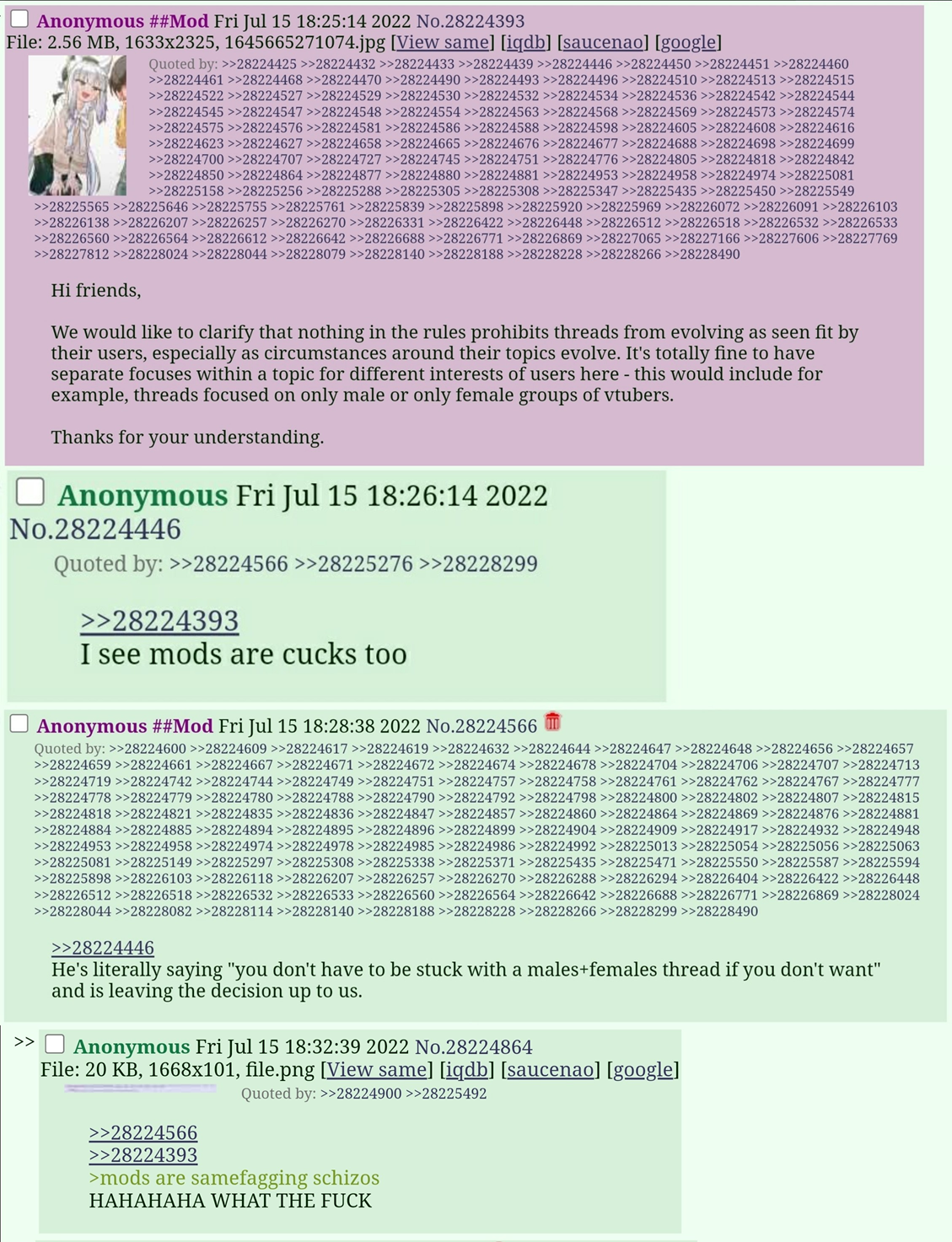 >>109477594NTA but>The mods dont hate hololive, they hate you. And its easy to see why.No, they quite literally hate Hololive, and we have proof of this thanks to the hack You can even see one of them pat himself on the back for being a "small corpo enjoy" while bitching about how there's inherent "holoboard bias" that he wants to "fix" lol>You believe this should be a hololive boardThis board was basically created because /hlgg/ and /hlg/ alone were to able to force /jp/ into being the top 5 fastest board on the site. Pre-hack, on any random given day about 40-60% of post made this board alone happened in /hlgg/, any event concerning Hololive would bump /vt/ into the top 1-2 fastest boards on the siteNobody "wants" this to be a hololive board, the fact that it IS based on both history and how poster behave is just an observable reality >The issue is that you are upset when other users of this board do not follow this rule you arbitrarily set. The "arbitrarily rules." of "don't shitpost" and "don't post doxx" if you find either of these are objectionable, then you should just accept you're a sub-human nobody wants to deal with when talking about their hobbies>You are upset about the 'head moderator' of the board interacting with vtubers that you do not want him to interact with. I mean, yeah? lmao It's a MASSIVE conflict of interest that head mod and the de facto head decision-maker of 4chan, is a fucking reply-guy for Phase girlsFurthermore it's not at all coincidental that PhaseConnect and it's members generally receives more preferential than pretty much any other corpo or singular vtuber >You are upset that people who discuss vtubers you do not want them to watch arent banned for mentioning those vtubersNo, I don't give fuck about which whore you watch, so long as you keep in your thread and out of mine >You claim the moral highground for all of this and claim that the problem is that the moderation is <not active enough>.Yeah? The proof is just looking at the fucking state of the catalog and seeing much of a mess this place is. Trolling/bait, doxx and flamewar threads as far the eye can see. This board is near unusable if actually like vtubers and aren't interested in dramashit or gossiping >You are a blight on this website and, genuinely, would be better off discussing vtubers on a subreddit or a dedicated and highly moderated fansite for discussing hololive vtubers rather than trying to pretend you are a 4chan poster.I hate nu-4chan users such as yourself, you came here believing all that bullshit about this place being "Le ebin internet hate machine!!1!! XD" and never realized you aren't supposed shit where you sleep. And now we're all stuck wading though the massive pile of shit that is modern 4chan because newfags don't lurk anymore and just instantly jump in to shitpost and troll, and all the mods and jannies stoke this behaviorI'd call you " the cancer killing 4chan" but the truth is, this site has been dead for more than a decade and people like me are stuck riding its corpse because we don't really have elsewhere to go