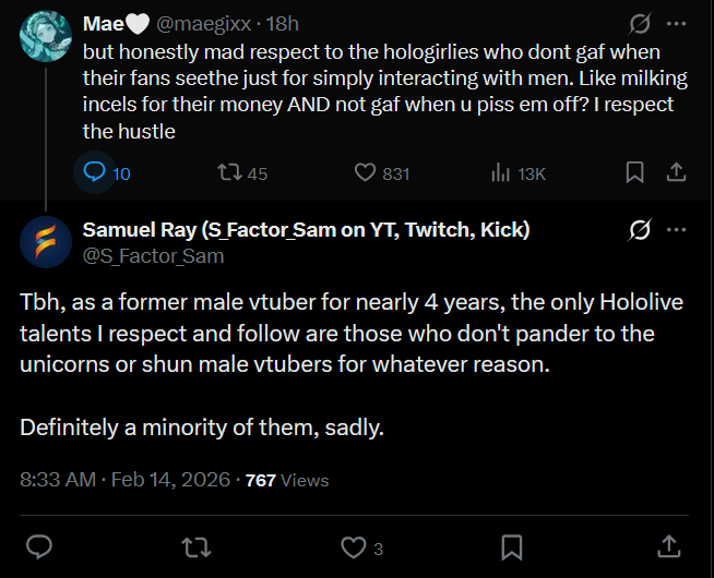 I think majority of unicorns are simply driven by tribalism. Because both Irys and Nimi are doing the same thing, while one is being praised, and other scolded by unicorns. I think that is only because Irys appeases unicorns, telling them "im on your side, i appreciate you". Even if her actions are equivalent to that of Nimi.