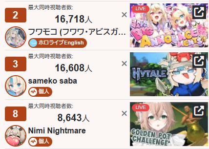 *GENERAL NUMBERFAG SITES*>https://playboard.co/en/>http://ikioi-ranking.com/>https://vrabi.net/>https://live-ranking.userlocal.jp/vtuber-rankingHololive sites>https://www.hololyzer.net/youtube/index.html>https://trackholo.live/en/>https://holo-spotify-stats.jirikunes.eu/Twitch>https://sullygnome.com/>https://twitchtracker.com/>https://stats.roki.sh/>https://streamscharts.com/