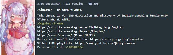 This thread is for the discussion and discovery of English-speaking female only VTubers who do ASMR.>Ongoing streamshttps://vt.rita.moe/?tag=genre:ASMR&tag=lang:Englishhttps://vt.rita.moe/?tag=thread:/tingles/https://asmrfarm.com/ (Mixed JP/EN)Rentry with useful information: https://rentry.org/tinglesveeteeVTuber ASMR playlists: https://www.youtube.com/@tinglesanonPrevious thread: >>109487057
