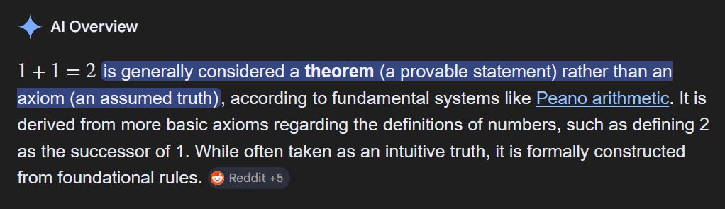 say we have an immortal queen bee that would mean it can reproduce infinite number of bees including another queen bee. say we have another distinct bee outside of the original first bee. do we write the equation as infinity + infinity or is it 1 + 1. the answer is neither, we only pick the numbers to be added at the moment that it will be added, now that doesn't mean the bee stopped being infinite we just capture at some point the number of bees we can count. if we add a triangle to a triangle do we get 2 triangles, no we get one hexagon. the axiom that 2+2=4 hinges entirely on 1+1=2 being true which can be written as adding a bee to a hexagon equates to 2 which is not true. to conclude gentlepigs 2+2=4 is not objectively true but is an agreed upon statement.https://youtu.be/bY3ZMOn9mHQ