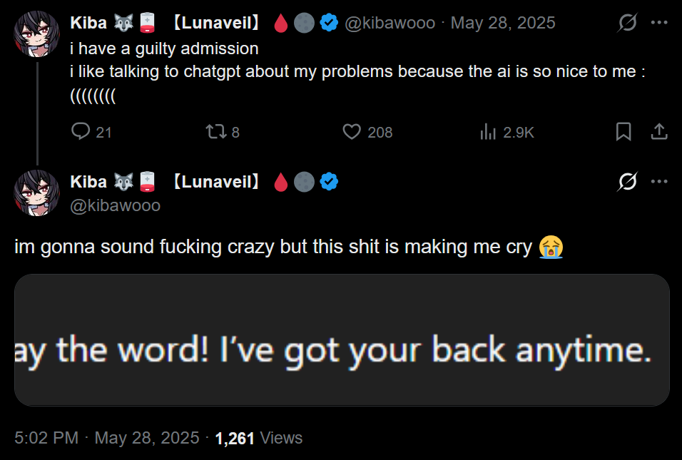>>109521104It's pretty worrying how susceptible women can be to this stuff. I'm not exactly sure how we got here, but I feel like it's our responsibility as men to be more emotionally available and help tend to their feelings. Though it's harder to do that when we're all enraptured by the Internet. I guess that just means that we have to be more outgoing and nicer online, not be afraid to reach out to people