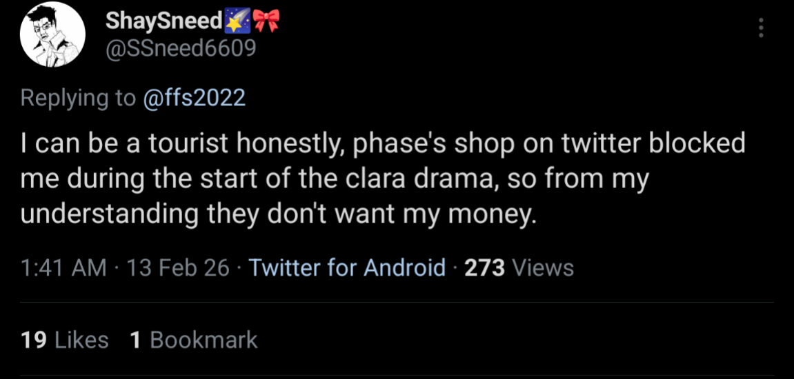 Answer me this labhams, what has Eimi actually offered to Phase?Her numbers suck, her content sucks, when she tries to play anything interesting, her groomers threaten to leave herJust remember that nobody will miss her when she goes. She really appears to be a shitty person inside from making fun of someone for wearing a shirt