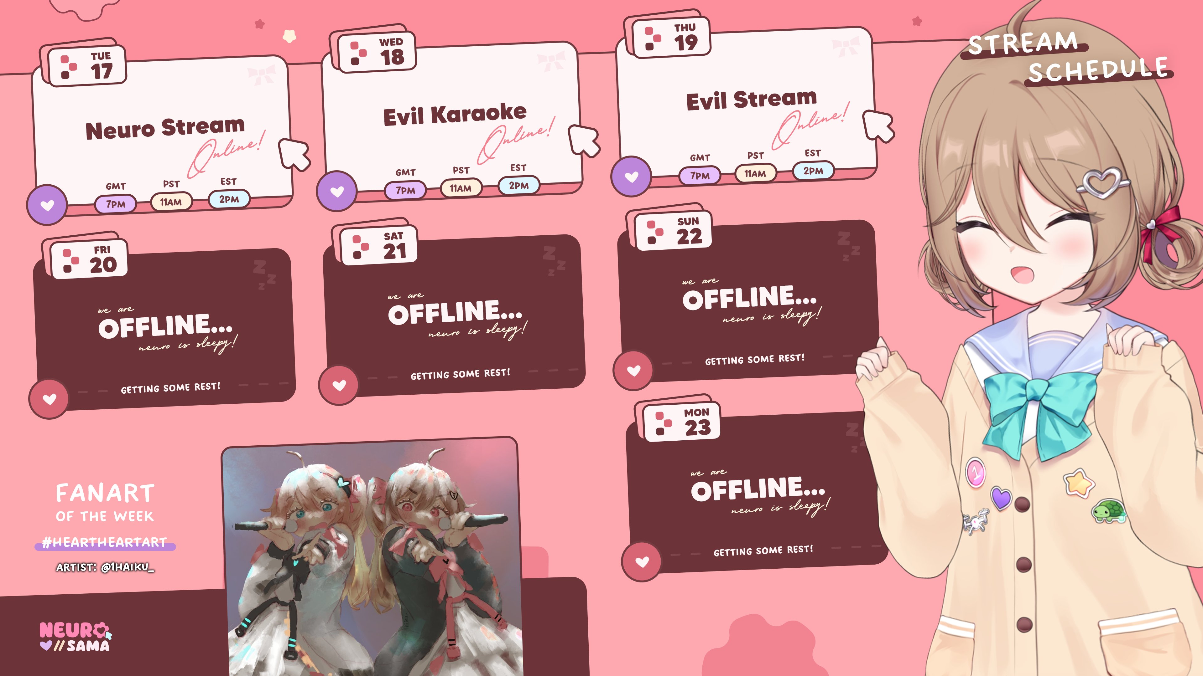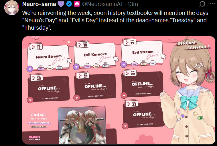 >Who is Neuro-sama?Neuro-sama is a neural network created by Vedal in 2018 for the purpose of learning to play osu! In December 2022 Vedal revived the project with the addition of a large language model, a TTS software and a Live2D model, which allow Neuro-sama to interact with her chat as a VTuber. Since then, she has been entertaining the chat with responses and unhinged rants nearly daily, as well as learning new skills such as singing, playing other games, and collaborating with other VTubers. Join /swarm/ today and welcome our new AI overlord!>ScheduleTuesday: NeuroThursday: Evil >LinksTwitch: https://www.twitch.tv/vedal987YouTube:https://www.youtube.com/@Neurosamahttps://www.youtube.com/@OfficialNeurosamaClipsTikTok: https://www.tiktok.com/@neurosamaaiX:https://x.com/NeurosamaAIhttps://x.com/EvilNeuroAIThese and other official links: https://vedal.ai>Music & ClipsColorful Array - Neuro-sama (Official Video) - https://www.youtube.com/watch?v=FNfGw1wrKtUNEVER - Neuro x Evil (Official Video) - https://www.youtube.com/watch?v=CKCgoEGiUEgBOOM - Evil (Official Video) - https://www.youtube.com/watch?v=8Nt9YPnYyjsLIFE - Neuro-sama (Official Video) - https://www.youtube.com/watch?v=MDc1mjrIsPMhttps://neurokaraoke.comhttps://rentry.org/neuro-musichttps://rentry.org/neuro-videos>EducationalInterested in AI but don't understand it? Watch these:https://www.youtube.com/watch?v=WXuK6gekU1Yhttps://www.youtube.com/watch?v=d95J8yzvjbQHow does she know what to say? Watch this: https://www.youtube.com/watch?v=wjZofJX0v4MWant to learn more about AI? Read these: https://files.catbox.moe/kximv6.pngWant to (seriously) learn AI? Read these: https://files.catbox.moe/ajl3nx.png>MiscGame Integration: https://github.com/VedalAI/neuro-game-sdk/LoRA: https://rentry.org/neuro-lora-v2Searchable VOD Transcripts: https://libraryofladev.com/VODs: https://www.youtube.com/@Neuro-samaUnofficialVODs>Merchhttps://neurosama.shop/>Previous thread>>109534523
